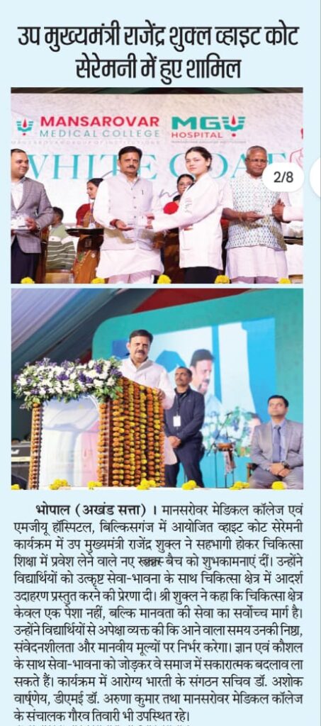 भोपाल मानसरोवर मेडिकल कॉलेज एवं एमजीयू हॉस्पिटल, बिल्किसगंज में आयोजित व्हाइट कोट सेरेमनी कार्यक्रम में उप…