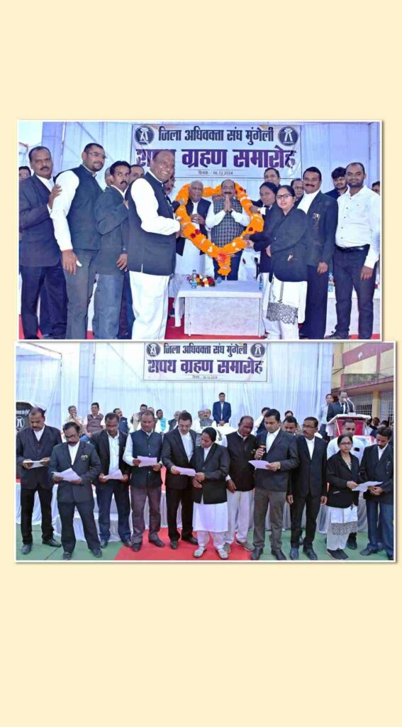 विधायक श्री पुन्नूलाल मोहले ने अधिवक्ता संघ के नवनिर्वाचित पदाधिकारियों को बधाई और शुभकामनाएं देते हुए आशा जताई कि सभी पदाधिकारी समाज की सेवा के लिए बेहतर कार्य करेंगे। जिला एवं सत्र न्यायाधीश श्री चन्द्र कुमार अजगल्ले ने मुंगेली बार की सराहना करते हुए अधिवक्ताओं को बिना किसी भेदभाव के पीड़ितों को समभाव से न्याय दिलाने की बात कही। कलेक्टर श्री राहुल देव, पुलिस अधीक्षक श्री भोजराम पटेल, पूर्व सांसद श्री लखन लाल साहू, मुंगेली नगर पालिका के अध्यक्ष श्री संतुलाल सोनकर, मुख्य न्यायिक मजिस्ट्रेट श्री बलराम देवांगन, द्वितीय व्यवहार न्यायाधीश वर्ग-एक वरिष्ठ श्रेणी श्रीमती रेशमा बैरागी पटेल, वरिष्ठ अधिवक्ता श्री गिरीश शुक्ला और श्री संजय गुप्ता भी समारोह में मौजूद थे।