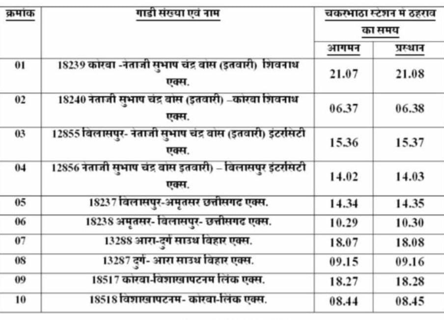 बिलासपुर । रेलवे प्रशासन द्वारा चकरभाठा में 09 एवं 10 जनवरी, 2025 को आयोजित चालीसा महोत्सव में शामिल होने वाले श्रद्धालुओं एवं रेल यात्रियों की सुविधा को ध्यान में रखते हुए 10 एक्सप्रेस गाडियों का अस्थायी ठहराव रायपुर मंडल के चकरभाठा स्टेशन में 01 मिनट के लिए दिया जा रहा है । यह ठहराव केवल 09 एवं 10 जनवरी, 2025 को 02 दिनों के लिए दिया जाएगा । रेल प्रशासन के द्वारा दिनांक 09 एवं 10 जनवरी, 2025 को रेल यात्रियों की सुविधा को ध्यान में रखते हुए 10 एक्सप्रेस गाडियों को चकरभाठा स्टेशन में ठहराव का समय निम्नानुसार है :-