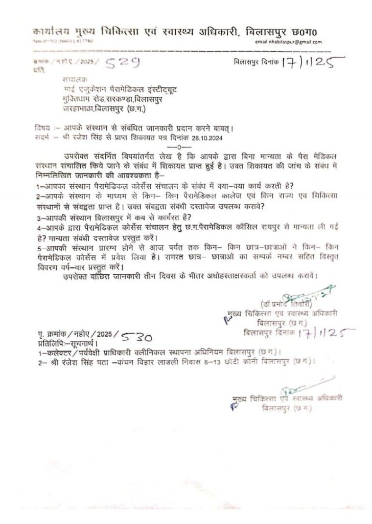 संस्थान से छत्तीसगढ़ पैरामेडिकल कौंसिल से मान्यता और दस्तावेज़ मांगे गए हैं।