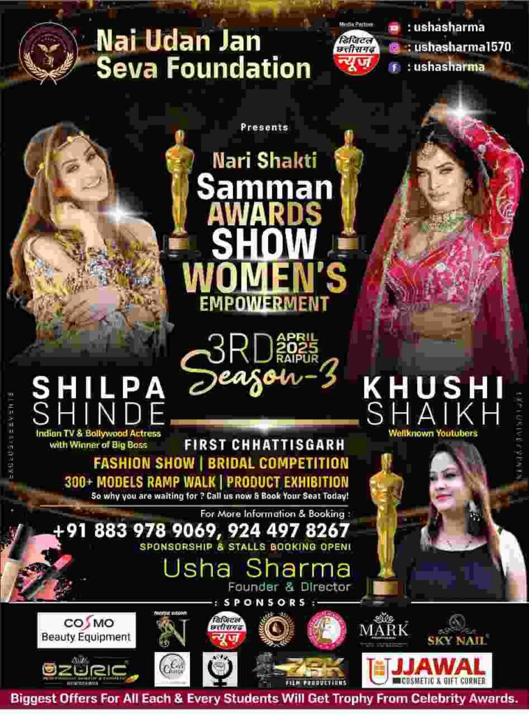 नई उड़ान जन सेवा फाउंडेशन के द्वारा वूमेंस डे के उपलक्ष में 3 अप्रैल को रायपुर में भव्य रूप से नारी शक्ति सम्मान समारोह का आयोजन हो रहा है जिसमें विभिन्न क्षेत्र से ( शिक्षा, पार्लर, मोटिवेशन क्लास, फैशन शो ,ब्राइडल शो , साथ ही सफाई कर्मी ,पुलिस कर्मी और चिकित्सा कर्मी ) क्षेत्र से महिलाओं को सम्मान दिया जाएगा जिससे उनका मनोबल व आत्मविश्वास आगे बढ़े और फाउंडेशन का यह नारी शक्ति सम्मान अवार्ड शो सीजन 3 होने जा रहा है। इससे पहले भी प्रशासन और शासन को लेकर के महिलाओं को नारी शक्ति सम्मान दिया जा चुका है। इस बार नारी शक्ति सम्मान के लिए मुंबई से सेलिब्रिटी गेस्ट शिल्पा शिंदे बिग बॉस विनर,भाभी जी घर पर है (फेम अंगूरी भाभी)और सोशल मीडिया सेंसेशन खुशी शेख आ रही है जिससे हर बार की तरह इस बार भी नारी शक्ति को सशक्त करने हेतु विभिन्न क्षेत्र के सामाजिक व व्यक्तिगत कार्य प्रणाली के द्वारा नारी शक्ति सम्मान अवार्ड से सम्मान किया जाएगा साथ ही ऐसी महिलाएं जो घर चलाने के साथ-साथ नौकरी करते हुए अपनी जिम्मेदारियां को पूर्ण रूप से कार्य करती हैं ऐसी महिलाएं जो विभिन्न क्षेत्रों में सेवा व नवीन योजनाओं के प्रति कार्य करती हैं ऐसी महिलाओं को नारी शक्ति सम्मान सम्मानित किया जाएगा नई उड़ान जन सेवा फाउंडेशन का सदैव उद्देश्य रहता है गांव व शहर में ऐसी शिक्षा लाई जाए जो बाहर जाकर न करना पड़े (नेल्स क्लास ,हेयर क्लास, स्किन क्लास ,मोटिवेशनल क्लास के माध्यम से नई टेक्नीक की जानकारी देकर उन्हें आगे बढ़ाने और सशक्त बनाते हैं। इस इवेंट को ऑर्गेनाइज करती हैं नई उड़ान जन सेवा फाउंडेशन की डायरेक्टर उषा शर्मा है और और इस शो को सपोर्ट करते हैं नई उड़ान जन फाउंडेशन की पूरी एंटायर टीम।