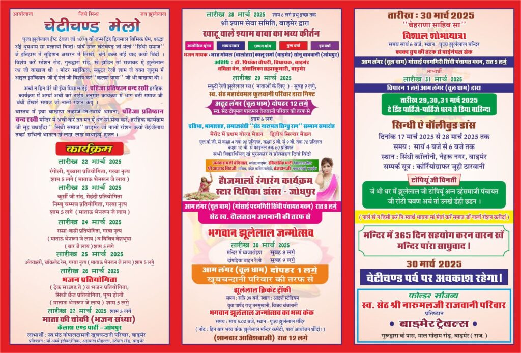 व रात्रि 8 बजे होजमालो रंगारंग सांस्कृतिक कार्यक्रम दीपिका जोधपुर द्वारा आयोजित किया जाएगा जिसमें सासंद उम्मेदाराम बेनीवाल, विधायक रविन्द्र सिंह भाटी, आजाद सिंह प्रदेश कांग्रेस कमेटी सचिव समाज सेवी तेजदान चारण उपस्थित रहेंगे व रात्रि में शानदार आतिशबाजी कर केक काटा जाएगा 30 मार्च को सुबह 9 बजे ध्वजारोहण,10 बजे दो पहिया वाहन रैली दोपहर 1 बजे लंगर प्रसाद शाम 6 बजे विशाल शोभायात्रा निकाली जाएगी जिसमें झांकी इस बार नऐ रूप में होगी व रात्रि 9 बजे झूलेलाल किकेट टूर्नामेंट का फाइनल मुकाबला आदर्श स्टेडियम में पार्षद राजीव तनसुखानी व विजय चंचलानी द्वारा आयोजित किया जाएगा व आम लंगर प्रसाद का आयोजन किया जाएगा 31 मार्च को दोपहर 1 बजे आरती कर महाप्रसादी आम लंगर का आयोजन किया जाएगा व शाम 6 बजे आरती व पल्लव के साथ मेले का समापन होगा इस अवसर पर पुरे शहर को रंगीन लाईटों,आयोलाल झूलेलाल की लाल पताकाओं व स्वागत द्वार, होल्डर, बैनर व मंदिर को गुलाब के फुलों से सजाया जाएगा मंदिर के मंत्री भगवान दास ठारवानी ने बताया कि आयोजन को लेकर विभिन्न कमेटी बनाकर कार्य क्रम को सफल बनाने के लिए कमेटी गठित की गई व 30 मार्च रविवार को सिंधी समाज के प्रतिष्ठान बंद रहेंगे 22 से मंदिर के पदाधिकारियों द्वारा डोर टू डोर आमंत्रण पत्र, कैलेण्डर व फोल्डर वितरण किए जाएंगे।