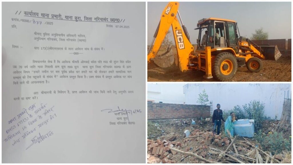 पीड़िता ओगबाई बघेल, पत्नी स्व. श्री सुंदर सिंह बघेल, निवासी ग्राम छुरा, तहसील छुरा, जिला गरियाबंद (छ.ग.) ने बताया कि 7 अप्रैल को दोपहर लगभग 4 बजे, संतोष सारडा और सी.बी. लोहार नामक व्यक्तियों ने पटवारी की उपस्थिति में उनकी भूमि ख.नं. 552 पर अतिक्रमण करते हुए, वहाँ स्थित पारिवारिक मठ को गिरा दिया। यह मठ उनके पूर्वजों, दिवंगत पति और पुत्र की स्मृति से जुड़ा हुआ था, जिसकी पूजा-अर्चना दशकों से की जा रही थी।
