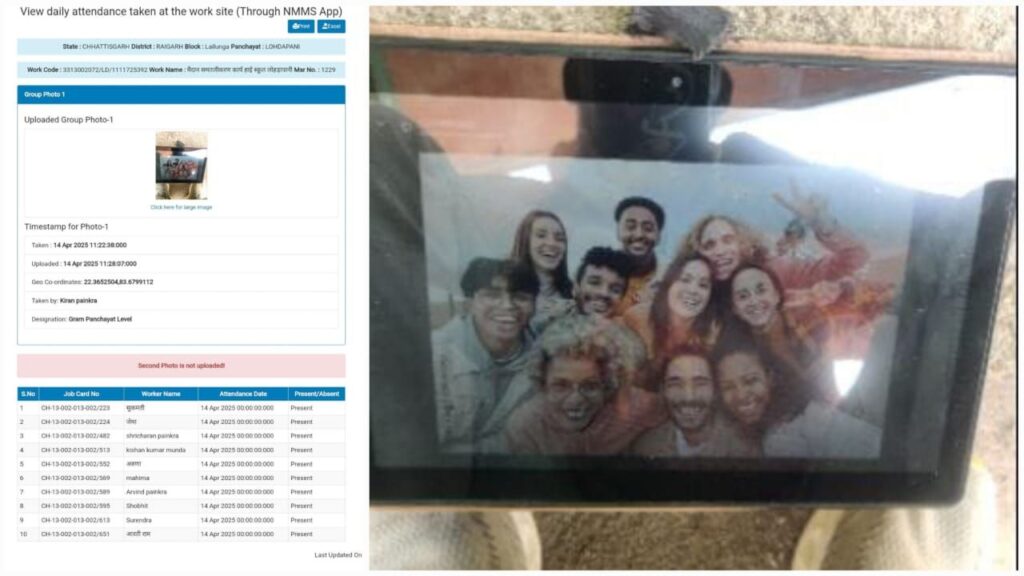*नई प्रणाली को भी बना दिया खिलौना :* NMMS ऐप का उद्देश्य था फर्जी उपस्थिति को रोकना। इसके लिए नियम है कि जो मजदूर कार्य स्थल पर कार्यरत हों, उन्हीं की उपस्थिति के साथ फोटो अपलोड की जाए। लेकिन यहां तो नियमों को ताक पर रख पंचायतकर्मियों ने एक ‘जुगाड़ तंत्र’ खड़ा कर लिया है।