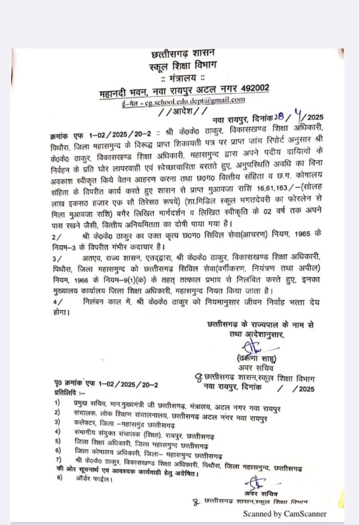 इस कार्रवाई की प्रतिलिपि मुख्यमंत्री कार्यालय, लोक शिक्षण संचालनालय, कलेक्टर महासमुंद, संभागीय संयुक्त संचालक रायपुर सहित संबंधित अधिकारियों को भी भेज दी गई है।