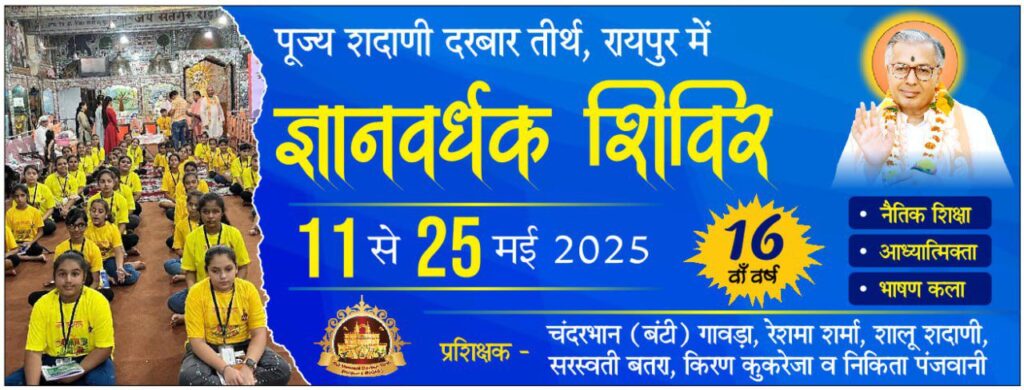रायपुर :- शदाणी दरबार तीर्थ में 11 मई (चतुर्दशी तिथि) से आरंभ हुआ ग्रीष्मकालीन बाल संस्कार शिविर 25 मई 2025 तक चलेगा। यह शिविर बच्चों में नैतिक मूल्यों, आत्मविश्वास और आध्यात्मिक चेतना के विकास के लिए एक समर्पित प्रयास है। लगातार 16वें वर्ष आयोजित हो रहे इस शिविर में देश-विदेश से बच्चे भारी संख्या में सहभागी बन रहे हैं। इस बार शिविर को हाइब्रिड फॉर्मेट (ऑफ़लाइन और ऑनलाइन) में संचालित किया जा रहा है, जिससे भारत सहित विदेशों में रहने वाले बच्चे और संत-महात्मा भी डिजिटल माध्यम से सक्रिय रूप से जुड़े हैं।