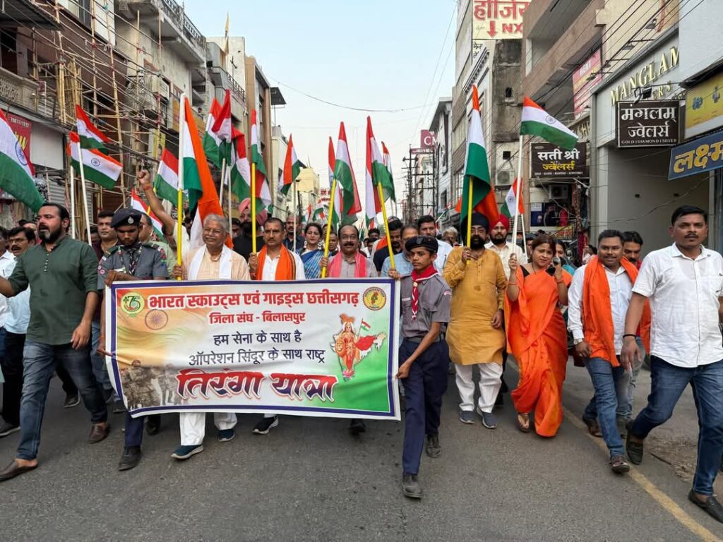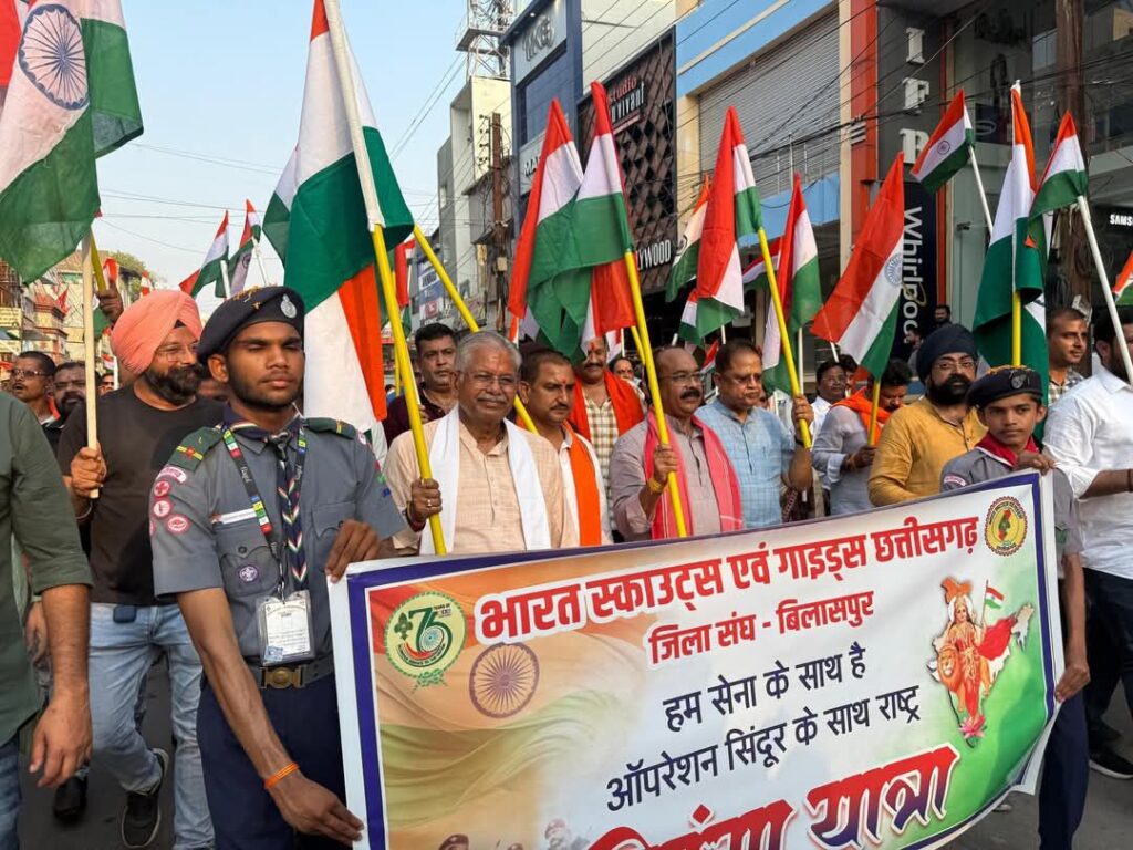 जिले में “ऑपरेशन सिंदूर” अभियान के अंतर्गत देशभक्ति से ओत-प्रोत तिरंगा यात्रा का भव्य आयोजन किया गया। जिला स्तरीय यात्रा को केंद्रीय आवासन एवं शहरी विकास राज्य मंत्री श्री तोखन साहू और उप मुख्यमंत्री श्री अरुण साव ने हरी झंडी दिखाकर रवाना किया। इस अवसर पर विधायक श्री अमर अग्रवाल, धरमजीत सिंह, धरम लाल कौशिक, श्री सुशांत शुक्ला, महापौर श्रीमती पूजा विधानी, जिला पंचायत अध्यक्ष श्री राजेश सूर्यवंशी, कमिश्नर श्री सुनील जैन, कलेक्टर श्री संजय अग्रवाल , एसएसपी श्री रजनेश सिंह सहित जनप्रतिनिधि, पंचायत एवं नगरीय निकायों के प्रतिनिधि, अधिकारी, आम नागरिक, बच्चे एवं जवान बड़ी संख्या में शामिल हुए और देश के प्रति अपनी एकजुटता एवं सम्मान प्रकट किया।