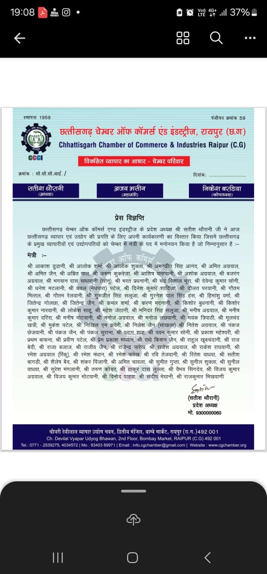 छत्तीसगढ़ चेम्बर ऑफ कॉमर्स एण्ड इंडस्ट्रीज के प्रदेश अध्यक्ष श्री सतीश थौरानी जी ने आज छत्तीसगढ़ व्यापार एवं उद्योग की प्रगति के लिए अपनी कार्यकारणी का विस्तार किया जिसमें छत्तीसगढ़ के प्रमुख व्यापारीयों एवं उद्योगपतियों को चेम्बर में मंत्री के पद में मनोनयन किया है जो निम्नानुसार है :-