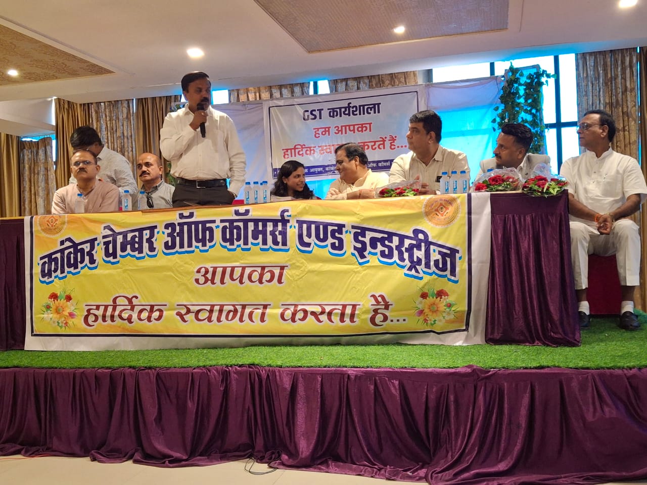 कांकेर-कांकेर चैंबर ऑफ कॉमर्स एंड इंडस्ट्रीज एवं राज्य सहायक कर आयुक्त,कांकेर के द्वारा संयुक्त रूप से नगर के होटल आनंदम में GST की कार्यशाला आयोजित की गई,,,,,जिसमें मुख्य अतिथि के रूप में छत्तीसगढ़ चैंबर ऑफ कॉमर्स एंड इंडस्ट्रीज के पुर्व अध्यक्ष रहें,कांकेर के व्यापारियों की हर समस्या में आधी रात को खड़े होने वाले प्रदेश चैंबर के संरक्षक एवं पुर्व विधायक रायपुर माननीय श्रीचंद सुंदरानी जी,छत्तीसगढ़ चैंबर के कार्यकारी अध्यक्ष माननीय राजेश वासवानी जी, छत्तीसगढ़ चैंबर के वाईस चेयरमैन एवं GST मामलों के बेहतर जानकार माननीय CA चेतन तारवानी जी जो विशेष रूप से कांकेर के व्यापारी भाइयों को GST की जानकारी देने पहुँचे थे,,,,,कार्यक्रम की अध्यक्षता चैंबर अध्यक्ष अनूप शर्मा ने किया,विशेष अतिथि के रूप में कांकेर ज़िला के प्रदेश उपाध्यक्ष अशोक राठी एवं छत्तीसगढ़ चेंबर के कांकेर ज़िला मंत्री महेश भोजवानी,कांकेर चेम्बर के पुर्व अध्यक्ष व भारतीय जनता पार्टी के जिला कोषाध्यक्ष राजा देवनानी शामिल थे l