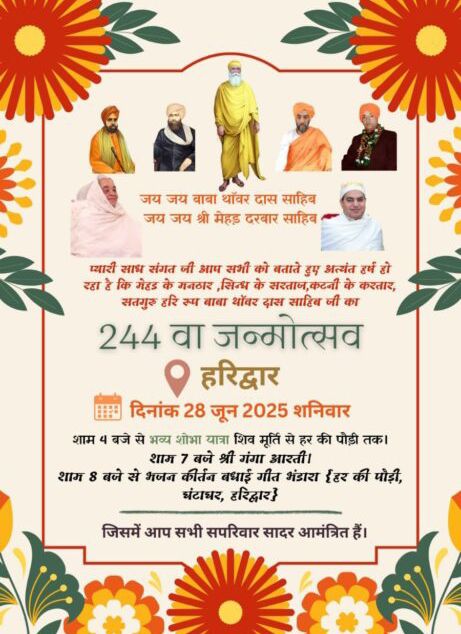 कटनी :- प्यारी साध संगत जी आप सभी को बताते हुए अत्यंत हर्ष हो रहा है कि मेहड के मनठार ,सिन्ध के सरताज,कटनी के करतार, सतगुरु हरि रूप बाबा थाॅवर दास साहिब जी का 244 वा जन्मोत्सव हरिद्वार की पावन भूमि में बड़े धूमधाम हर्षोल्लास से मनाया जाएगा। जिसमे आप सभी सपरिवार सादर आमंत्रित हैं।