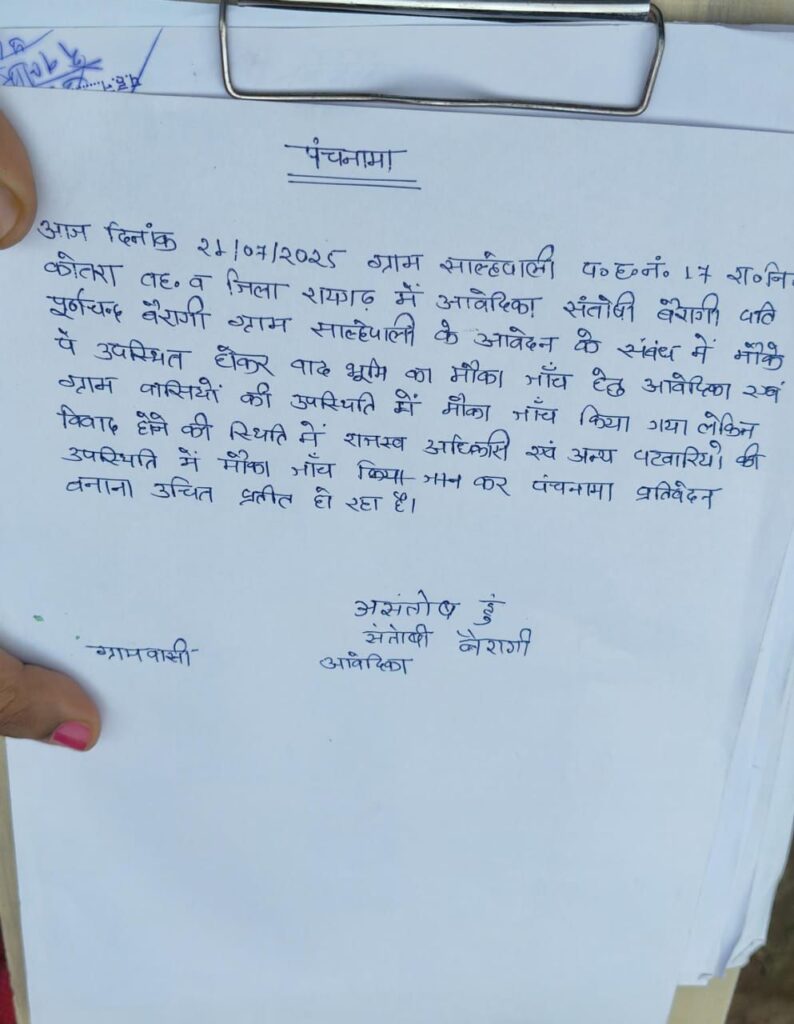 गौरतलब हो कि आवेदिका के परिवार से गांव के दबंगों द्वारा पूर्व में मारपीट भी की गई थी जिसकी उसे और थाने में रिपोर्ट दर्ज कराई गई है। दबंग से विवाद के चलते उन्होंने गांव छोड़ दिया है और न्याय की आश में पिछले 2 साल से बेघर महिला अपने परिवार सहित सारंगढ़ में किराए के मकान पर रह रही है। इस बीच आज 21 जुलाई 2025 को पटवारी जांच के लिए गांव पहुंचा, परंतु नक्शा अधूरा होने के कारण मौके पर सीमांकन नहीं हो सका। जबकि पंचनामा में यह दर्ज किया गया कि भूमि विवाद के कारण जांच किसी अन्य पटवारी द्वारा कराई जानी चाहिए। पीड़िता का आरोप है कि यह केवल औपचारिकता निभाने जैसी कार्रवाई थी, जिससे अब न्याय की उम्मीद भी कमजोर पड़ रही है।
