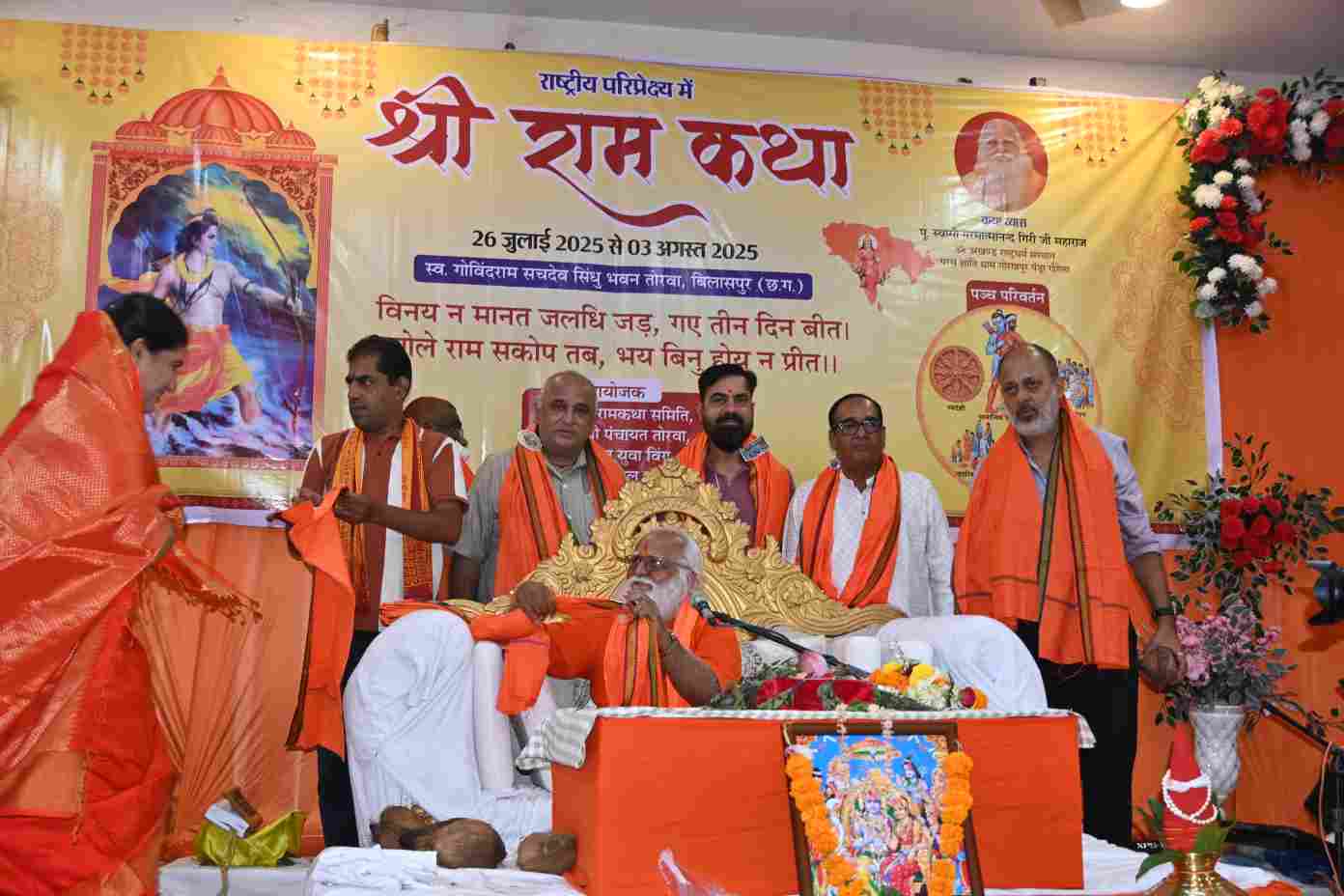 बिलासपुर :- श्री राम कथा का आयोजन सिंधु भवन तोरवा बिलासपुर में विगत 26 जुलाई से आरंभ है प्रतिदिन हजारों की संख्या में भक्त जन रसपान कर रहे हैं इस अवसर पर कई नेता अभिनेता पहुंचकर संत जी से आशीर्वाद ग्रहण कर रहे हैं इसी अवसर पर बिलासपुर नगर की जय झूलेलाल पूज्य सिंधी पंचायत मंगला के संरक्षक कैलाश मलघानी, अध्यक्ष राजेश छुघानी ,शिव धामेचा नवीन जादवानी वह अन्य सदस्यों ने कथा में पहुंचकर कथा का रसपान किया विधि विधान के साथ पूजा अर्चना की आरती की व्यास पीठ पर बैठे संत स्वामी परमानंद गिरि जी महाराज का पंचायत की तरफ से स्वागत सत्कार किया गया ,