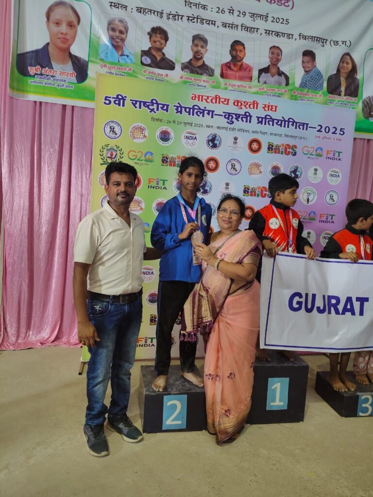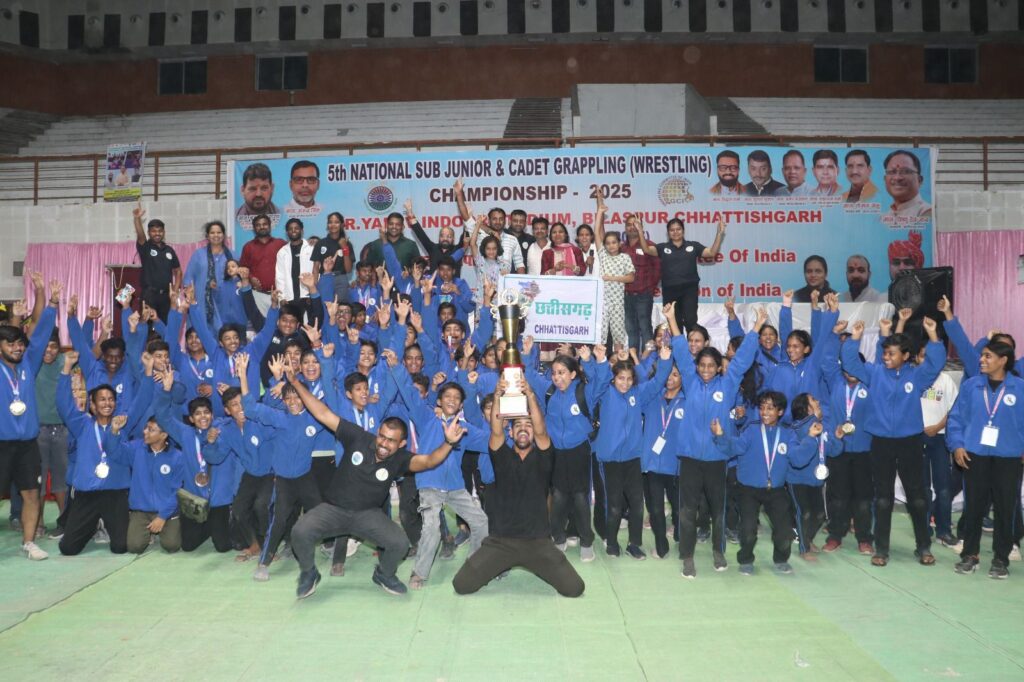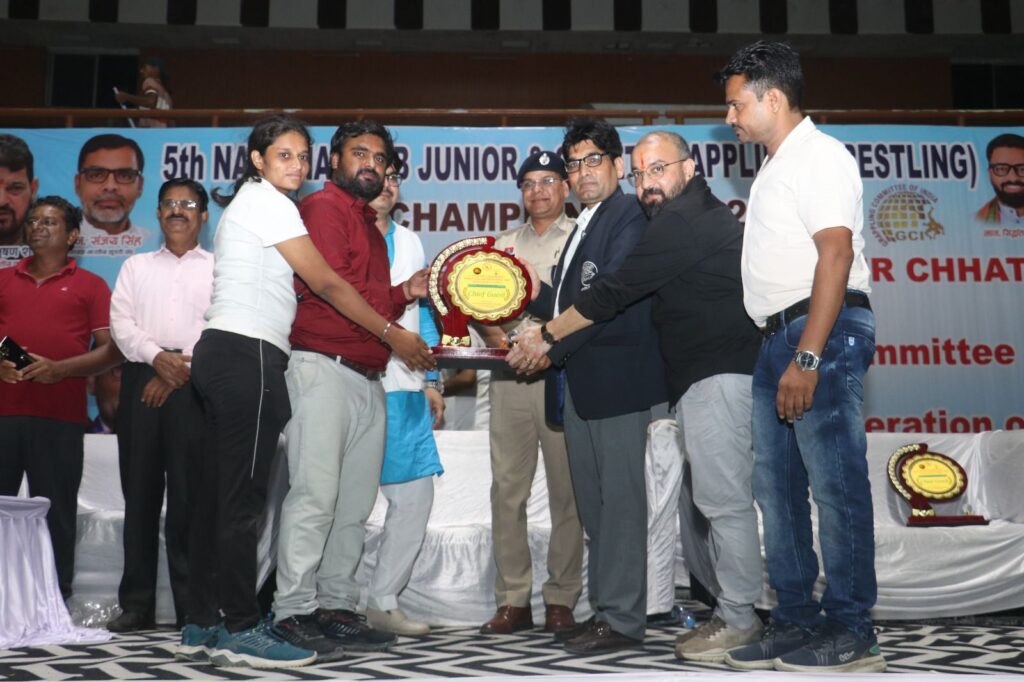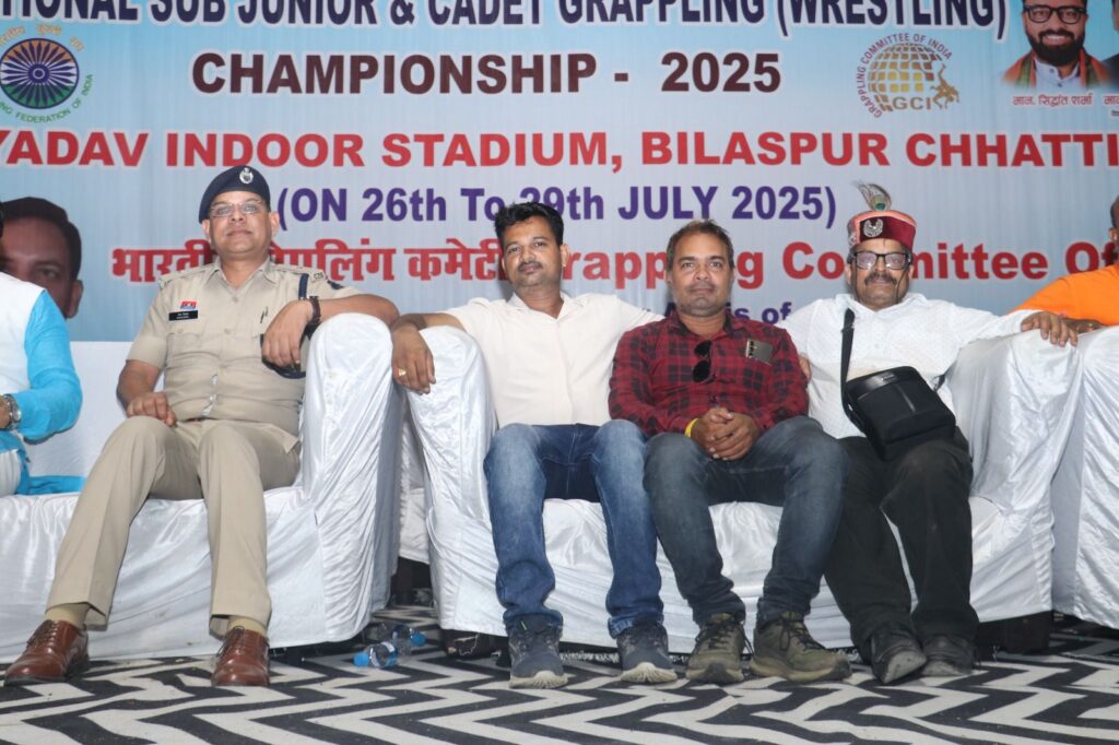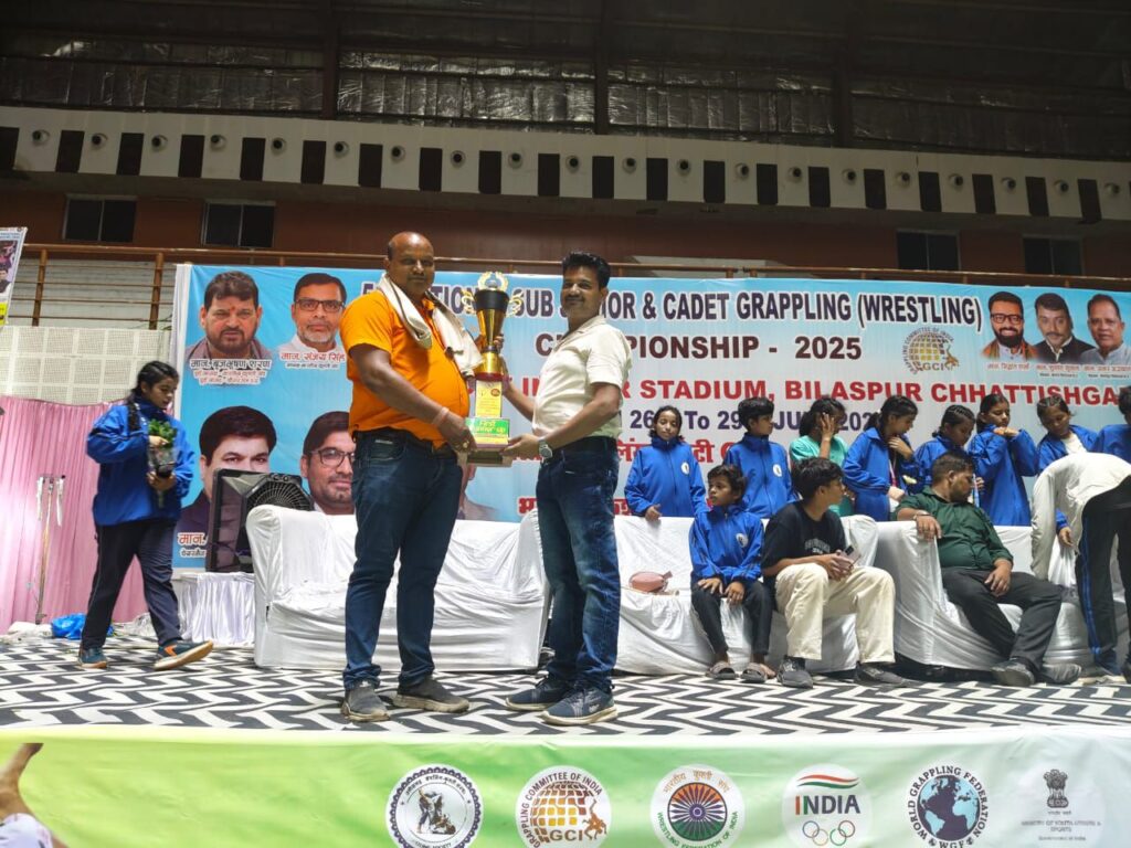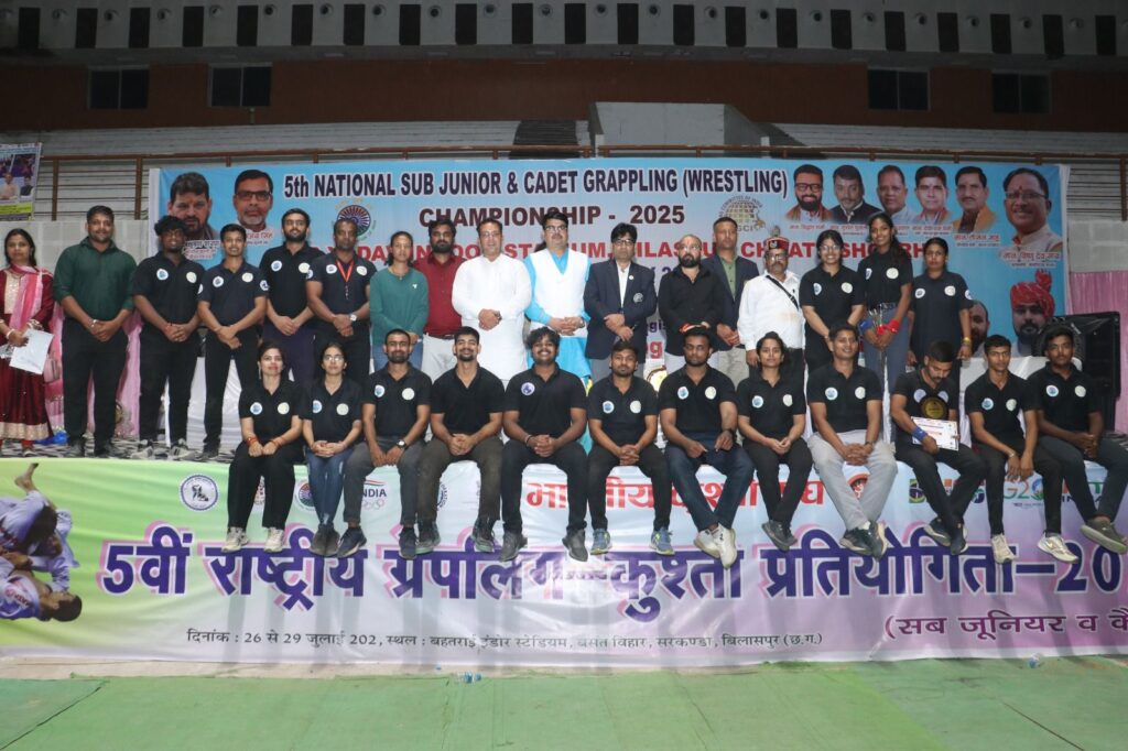 बिलासपुर :- छत्तीसगढ़ के जनरल सेक्रेटरी के हेमंत कुमार ने जानकारी दी है कि बिलासपुर के बहतरई स्टेडियम में 27 जुलाई 2025 से लेकर 29 जुलाई 2025 तक पांचवी सब जूनियर राष्ट्रीय ग्रेपलिंग कुश्ती प्रतियोगिता संपन्न हुई इस प्रतियोगिता के समापन समारोह में सीएम हाउस छत्तीसगढ़ से प्रतिनिधि मंडल के सदस्य माननीय श्री खूब लाल ध्रुव जी एवं