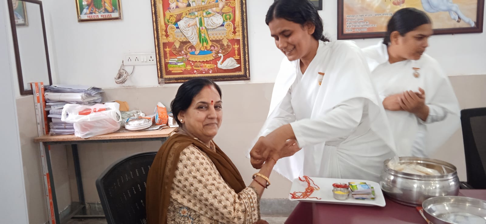 तो उसे तिलक लगाया जाता है ताकि उसे उस कार्य में सफलता मिले, राखी अथवा रक्षा सूत्र का अर्थ है पवित्रता एवं सदा उस आत्मा की सुरक्षा हो जिसे यह राखी अथवा रक्षा सूत्र बांधा जा रहा है एवं मुख मीठा का अर्थ है अपने जीवन में सदा मधुरता लाना मुख से सदा मधुर महावाक्यों का ही उच्चारण करना इन्हीं तीन स्मृतियों के साथ ब्रह्माकुमारी राजयोगिनी पूर्णिमा दीदी एवं अंजू दीदी जी ने महारानी लक्ष्मी बाई के समस्त शिक्षकगण को तिलक लगाया, राखी बांधी एवं परमात्मा के घर की बनी हुई मिठाई खिलाई