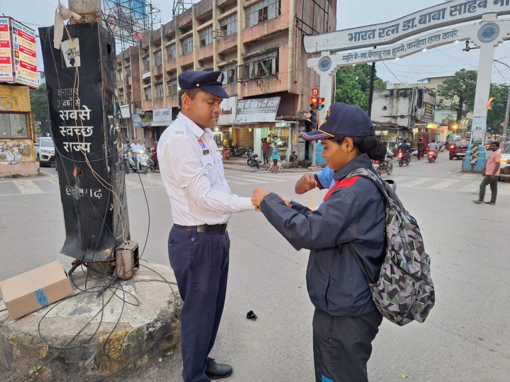 त्यौहार के दौरान रोड में यातायात व्यवस्था संभालतेट्रैफ़िक के जवानों को भी राखी बाँध कर मनाया रक्षाबंधन कापर्व