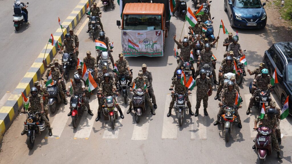 बिलासपुर, अगस्त,2025/हर घर तिरंगा अभियान के तहत सीआरपीएफ बिलासपुर बटालियन ने भव्य बाइक रैली निकाली। सीआरपीएफ केंद्र भरनी से निकली इस रैली में अधिकारी और जवान तिरंगे से सजी मोटरसाइकिलों पर निकले और लोगों को हर घर तिरंगा अभियान में भागीदारी का संदेश दिया।