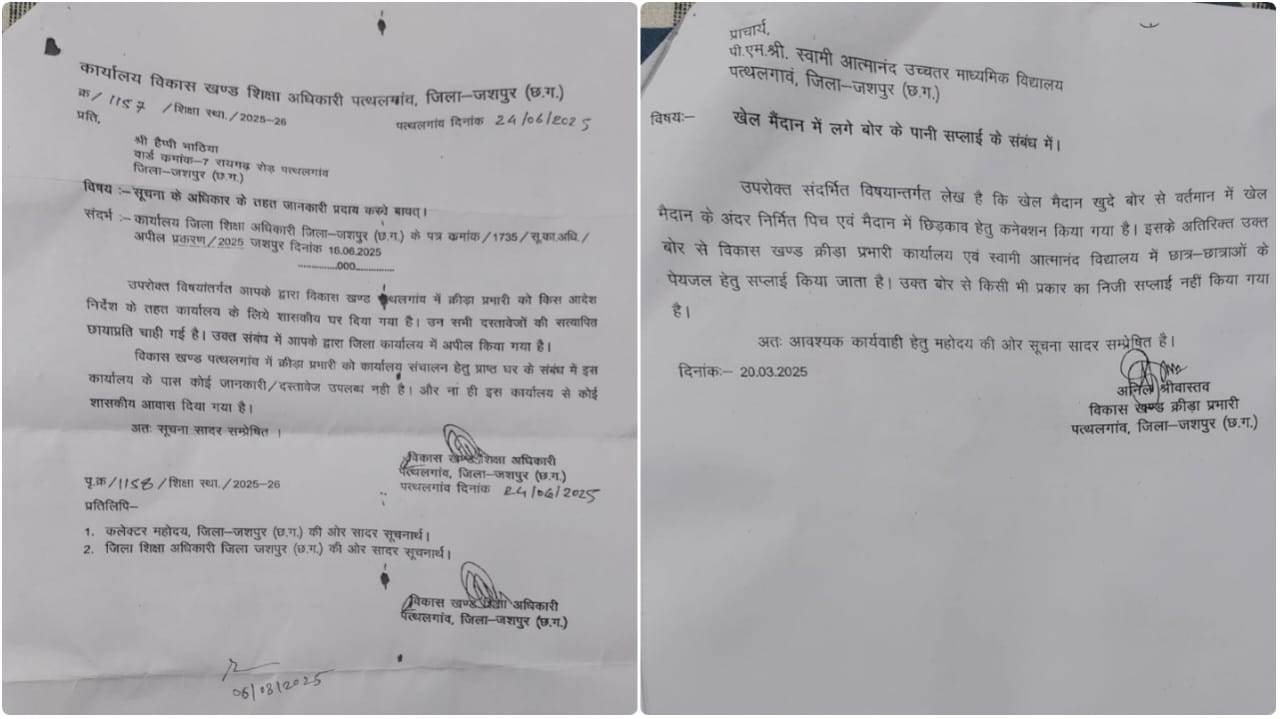 जशपुर। जिले के पत्थलगांव में शिक्षा विभाग और खेल प्रभारी से जुड़े दो दस्तावेज़ों ने पूरे क्षेत्र में प्रशासनिक पारदर्शिता पर गंभीर सवाल खड़े कर दिए हैं। मामला शासकीय आवास और खेल मैदान के बोरिंग के पानी की सप्लाई से जुड़ा है। दोनों पत्रों में विभागीय दावों और जमीनी हकीकत में गहरा विरोधाभास साफ दिखाई देता है।