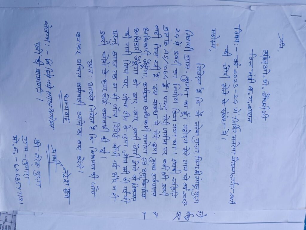 रायगढ़। मनरेगा योजनाओं की हकीकत का पर्दाफाश लैलूंगा में हुआ है। नवीन कुंजारा निवासी नरेश गुप्ता का आरोप है कि उनके नाम पर ग्राम पंचायत ने फर्जी डबरी निर्माण दिखाकर ₹1,35,000 की राशि हड़प ली, जबकि जमीन पर एक इंच भी काम नहीं हुआ।
