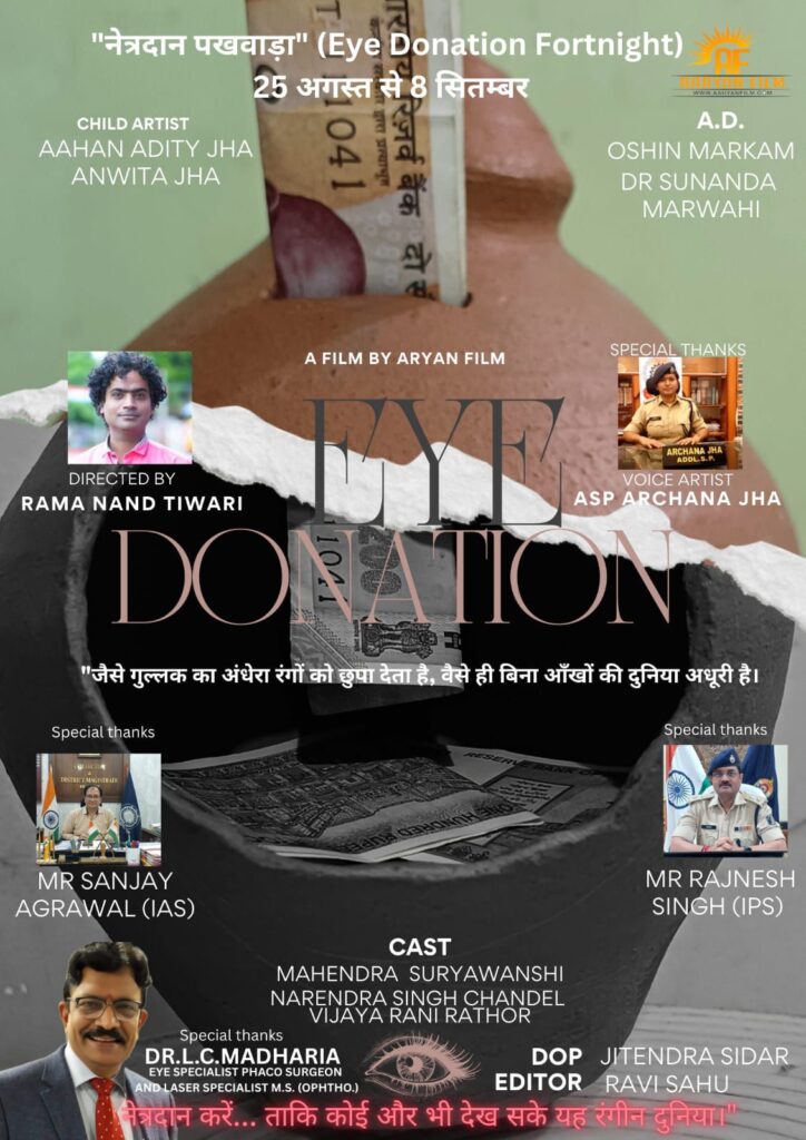 बिलासपुर :- जिसका पोस्टर लॉन्चिंग बिलासपुर वरिष्ठ पुलिस अधीक्षक श्री रजनेश सिंह (IPS) एवं बिलासपुर कलेक्टर श्री संजय अग्रवाल (IAS) ने किया । पोस्टर लॉन्चिंग के समय ASP श्री मति अर्चना झा ASP श्री राम गोपाल करियारे, आशीर्वाद लेज़र फेको आई हॉस्पिटल के डायरेक्टर डॉ. एल.सी.मढरिया, फ़िल्म के डायरेक्टर आर्यन तिवारी, असिस्टेंट डायरेक्टर डॉ. सुनंदा मरावी एवं ओशीन मरकाम , एक्टर महेंद्र सूर्यवंशी, नरेंद्र सिंह चंदेल, विजया रानी राठौर उपस्थिति रहे / फ़िल्म में चाइल्ड आर्टिस्ट के तौर पर आहान आदित्य झा, अन्विता झा ने