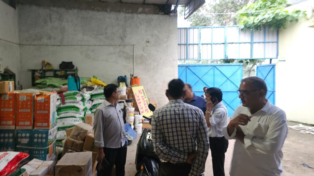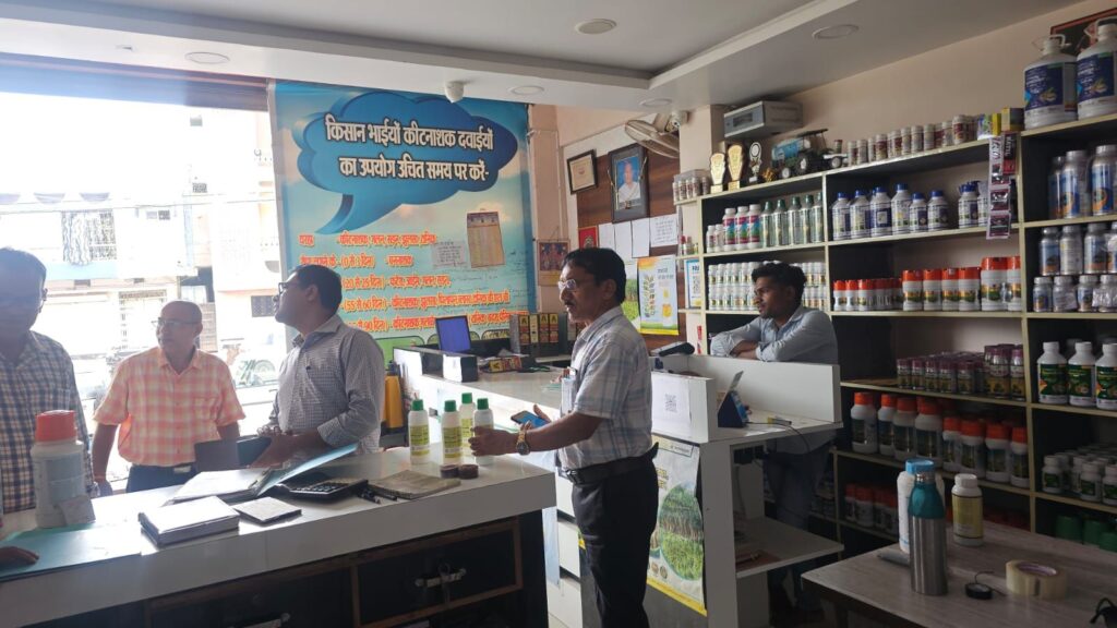 विजय धीरज ग्रा.कृ.वि.अ. (कार्या.) के द्वारा जिले के विकासखण्ड तखतपुर अंतर्गत मेसर्स संकट मोचन खाद भंडार तखतपुर, मेसर्स गोपाल खाद भंडार खमतराई का औचक निरीक्षण किया गया। निरीक्षण के दौरान मेसर्स संकट मोचन खाद भंडार तखतपुर में बिना फार्म ओ इन्द्राज कराये बायो उर्वरक का भंडारण पाये जाने के फलस्वरूप तत्काल उपलब्ध बायो उर्वरक बायो आर्गेनिक 65 कि.ग्रा., हुमिक एसिट-170 कि.ग्रा. को विक्रय प्रतिबंध करते हुए जब्ती की कार्रवाई कर नोटिस जारी किया गया । तथा मेसर्स गोपाल खाद भंडार खमतराई में स्कंध प्रदर्शित नही करने, नियमित प्रतिवेदन नही भेजने,
