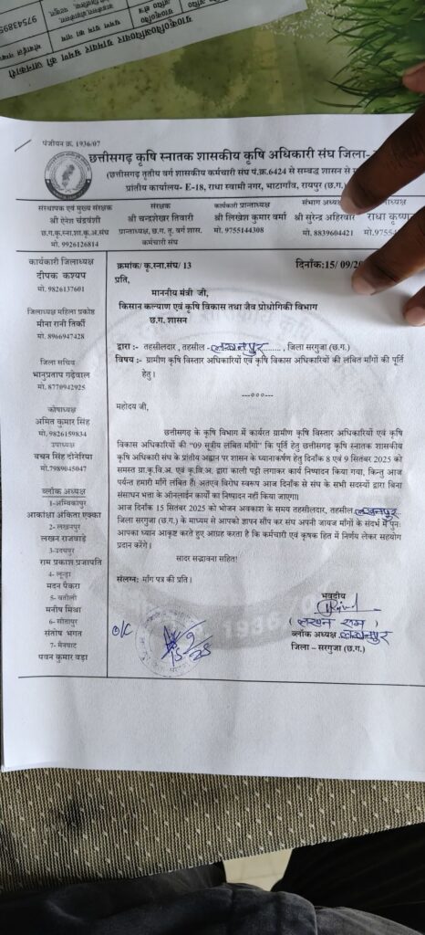 प्रातीय कार्यकारिणी छत्तीसगढ़ संघ के आह्वान पर सोमवार को लखनपुर क्षेत्र के कृषि विस्तार अधिकारियों ने अपनी विभिन्न लंबित समस्याओं और अधिकारों को लेकर एकजुट होकर तहसीलदार को मुख्यमंत्री के नाम ज्ञापन सौंपा। अधिकारियों ने इस दौरान स्पष्ट कहा कि यदि समय रहते उनकी समस्याओं का समाधान नहीं किया गया तो वे ऑनलाइन कार्यों का बहिष्कार करने के लिए बाध्य होंगे।