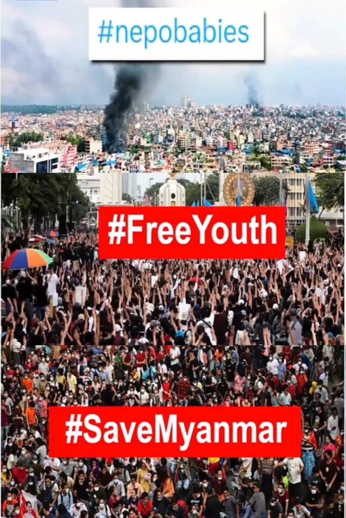साथियों बात अगर हम जेन ज़ेड के वैश्विक आंदोलनों को समझने की करें तो, नेपो बेबीज़, फ्री यूथ और सेव म्यांमरजेन ज़ेड के नेतृत्व में कई आंदोलन वैश्विक चर्चा का केंद्र बने: (1) नेपो बेबीज़ मूवमेंट-हॉलीवुड और बॉलीवुड दोनों जगह इस ट्रेंड ने वंशवाद और पारिवारिक प्रभुत्व पर सवाल उठाया। युवाओं ने पारदर्शिता और मेरिट की मांग उठाई। (2) फ्री यूथ मूवमेंट-थाईलैंड, हांगकांग और एशिया के अन्य हिस्सों में लोकतंत्र और मानवाधिकारों की लड़ाई में जेन ज़ेड की भूमिका प्रमुख रही। (3)सेव म्यांमर मूवमेंट -2021 में म्यांमार में सैन्य तख़्तापलट के खिलाफ जेन ज़ेड ने न केवल सड़कों पर प्रदर्शन किया, बल्कि ट्विटर और फेसबुक पर वैश्विक अभियान चलाकर दुनियाँ का ध्यान खींचा।इसके अलावा फ्राइडेज़ फॉर फ्यूचर (ग्रेटा थूनबेर्ग) जैसे क्लाइमेट मूवमेंट्स, ब्लैक लाइव्स मैटर जैसे समानता के आंदोलन और #मी टू जैसी डिजिटल मुहिम में भी जेन ज़ेड ने अहम भूमिका निभाई।