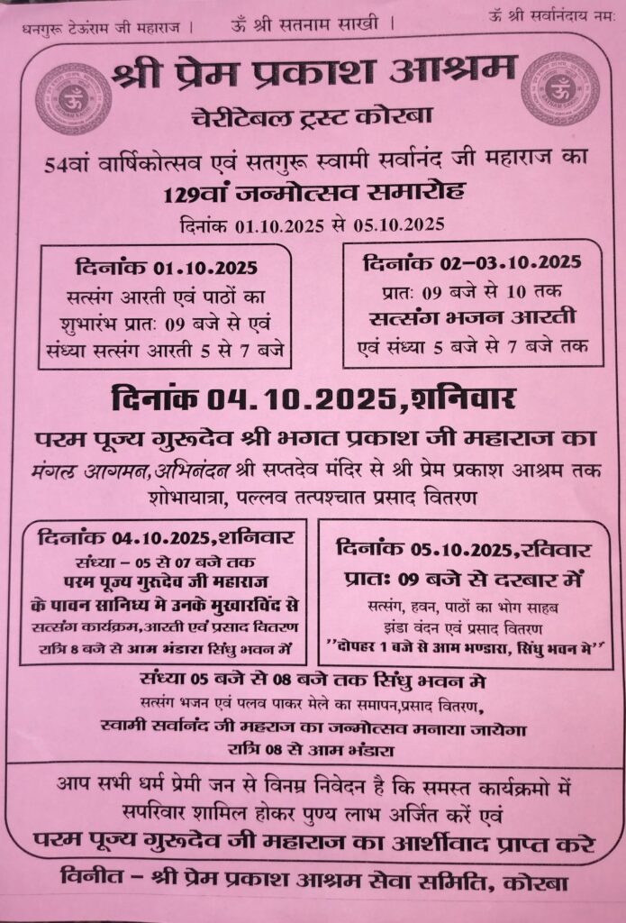 श्री प्रेम प्रकाश आश्रम कोरबा में प्रति वर्ष स्वामी जी के सानिध्य में मनाया जाने वाले इस 05 दिवसीय वार्षिकोत्सव की पावन शुरुआत इस वर्ष 01 अक्टूबर से प्रातः 9 बजे से “श्री प्रेम प्रकाश ग्रंथ” के श्री पाठ साहेब के आरंभ से होगी। जिसके पश्चात 01 से 03 अक्टूबर तक प्रतिदिन सुबह 9 बजे से 10 बजे व संध्या 5 बजे से 07 बजे तक भजन सत्संग व आरती की जायेगी।