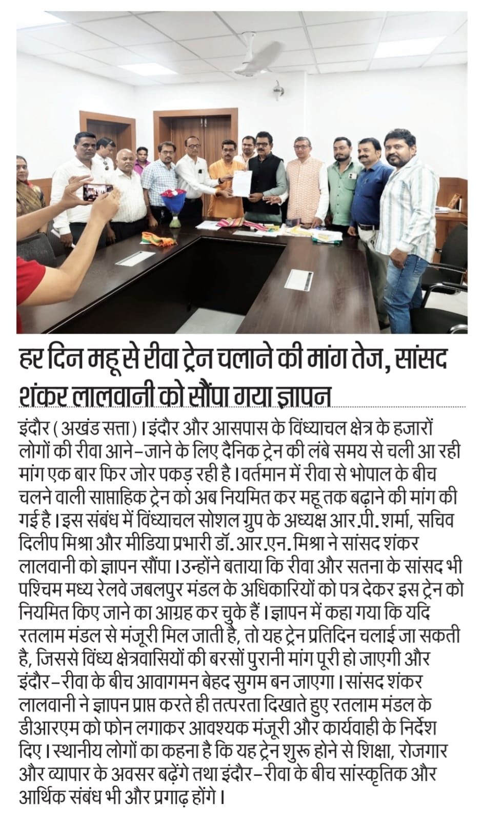 इस संबंध में विंध्याचल सोशल ग्रुप के अध्यक्ष आर.पी. शर्मा, सचिव दिलीप मिश्रा और मीडिया प्रभारी डॉ. आर.एन. मिश्रा ने सांसद शंकर लालवानी को ज्ञापन सौंपा। उन्होंने बताया कि रीवा और सतना के सांसद भी पश्चिम मध्य रेलवे जबलपुर मंडल के अधिकारियों को पत्र देकर इस ट्रेन को नियमित किए जाने का आग्रह कर चुके हैं।