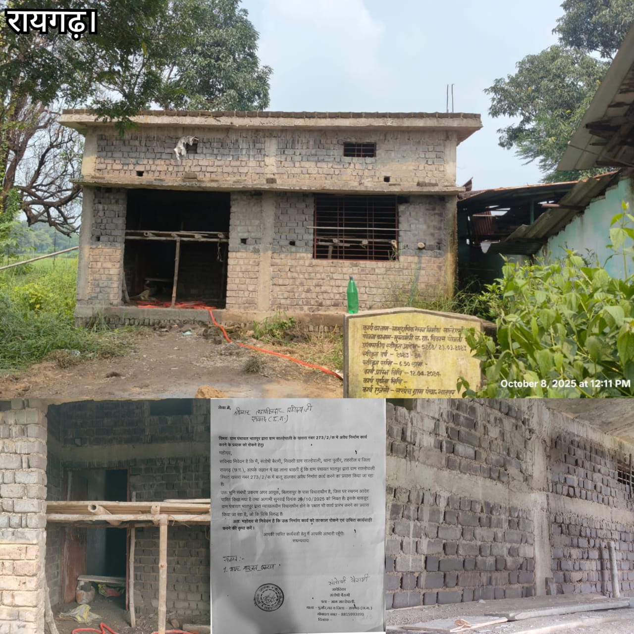 जानकारी के अनुसार, आवेदिका संतोषी बैरागी, निवासी ग्राम साहलेपाली, ने तहसीलदार रायगढ़ को लिखित शिकायत में स्पष्ट रूप से उल्लेख किया है कि संबंधित भूमि पर निर्माण कार्य पर दिनांक 24 अक्टूबर 2025 तक स्थगन आदेश लागू है। इसके बावजूद, ग्राम पंचायत प्रतिनिधियों की मिलीभगत से वहां बलपूर्वक निर्माण कार्य कराया जा रहा है।