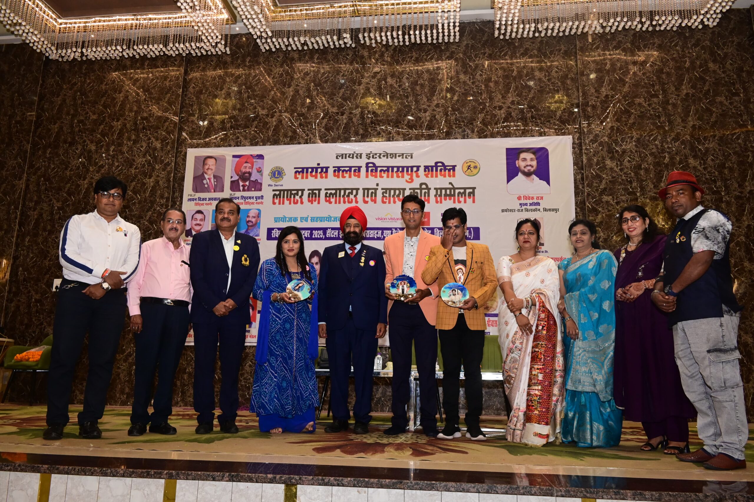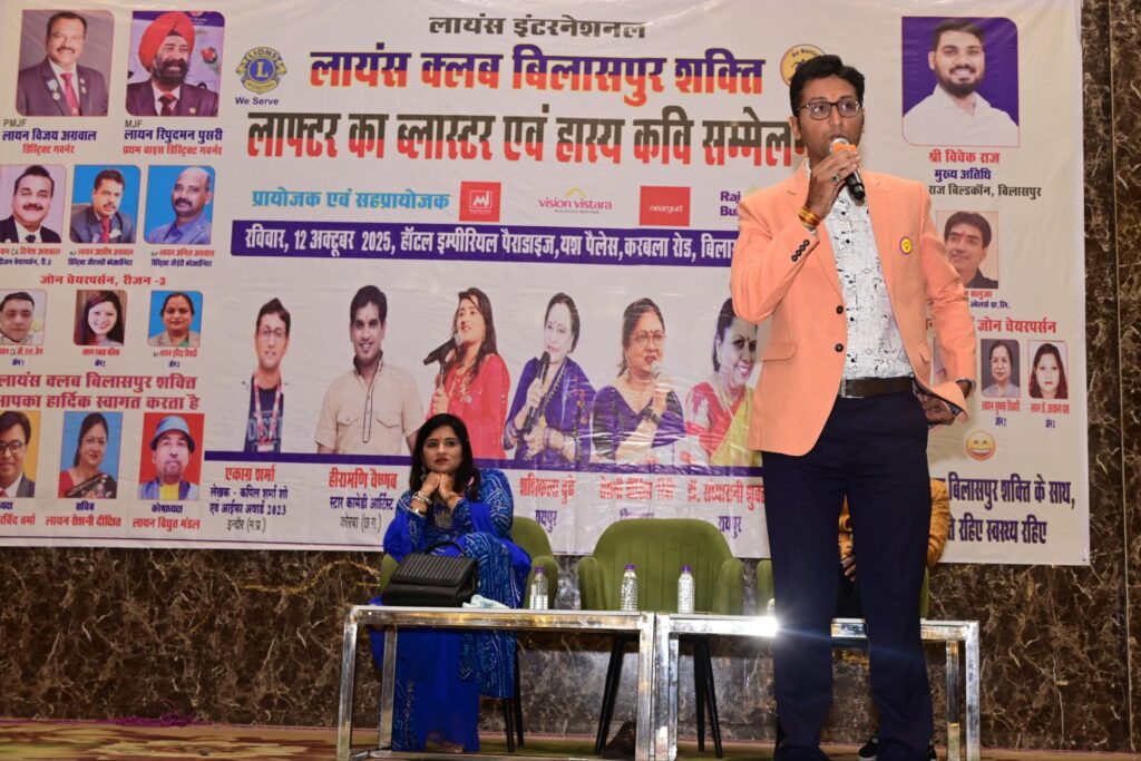 लायंस क्लब बिलासपुर शक्ति द्वारा, लायंस इंटरनेशनल मानसिक स्वास्थ्य सेवा सप्ताह( 4से 12अक्टूबर)के समापन में लोगों में बढ़ते मानसिक तनाव को कम करने के लिए अध्यक्ष ला अरविन्द वर्मा की अध्यक्षता में दिनांक 12अक्टूबर को होटल इम्पीरियर पैराडाइज यश पैलेश में लाफ़्टर का ब्लास्टर व हास्य कवि सम्मेलन का आयोजन किया गया। जिसके प्रयोजक व मुख्य अतिथि श्री विवेक राज डायरेक्टर राज बिल्डकॉन,विशिष्ट अतिथि व सहप्रायोजक – श्री रिपुदमन पुसरी,रीजन 3चेयरपर्सन श्री दिनेश अग्रवाल, श्री राजू सलूजा जी के साथ साथ नियरगुड व विजन विस्तारा ग्रुप थे