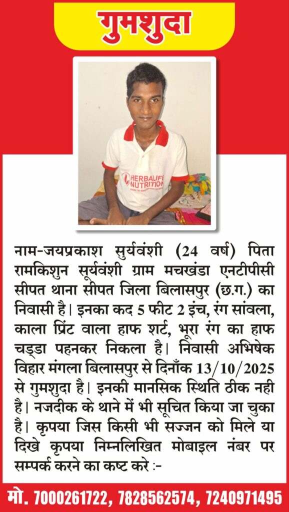 नाम-जयप्रकाश सुर्यवंशी (24 वर्ष) पिता रामकिशुन सूर्यवंशी ग्राम मचखंडा एनटीपीसी सीपत थाना सीपत जिला बिलासपुर छ ग़ का निवासी है। इनका कद 5 फीट 2 इंच, रंग सांवला, काला प्रिंट वाला हाफ शर्ट, भूरा रंग का हाफ चड्डा पहनकर निकला है। निवासी