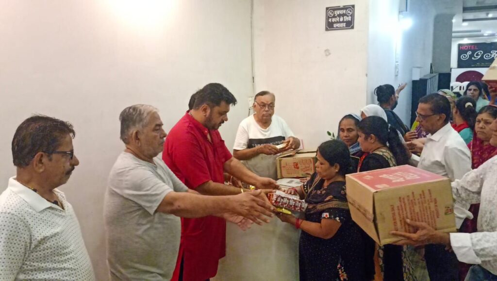 भोपाल- संत हिरदाराम नगर- जय मा काली मंदिर समिति , द लाॅयन सिटी वेलफेयर सोसायटी, युवा पत्रकार वेलफेयर क्लब ओर हिन्दू हेल्पलाइन मध्य प्रदेश द्वारा दीपावली के अवसर पर धनतेरस के दिन सैकड़ो माता बहनों , बुजुर्गो व बच्चों को मिठाई, खाद्य सामग्री व पूजन सामग्री वितरण की गई । इस अवसर पर जय मा काली मंदिर समिति के महासचिव , द लाॅयन सिटी वेलफेयर सोसायटी व युवा पत्रकार वेलफेयर क्लब के संस्थापक अध्यक्ष तथा हिन्दू हेल्पलाइन मध्य प्रदेश के प्रदेश अध्यक्ष कमलेश रायचंदानी विशेष रूप से मौजूद रहे और उन्होंने सभी माता बहनों को दीपावली की बधाइयां दी ओर कहा कि अगर खुशियां प्राप्त करनी है तो खुशियां बाटे, सभी लोगों को दीपावली का पर्व सबके साथ मिलकर मिठाइयां व खुशियां बाटकर मानना चाहिए। सभी माता बहनों ने अध्यक्ष कमलेश रायचंदानी , द लाॅयन सिटी