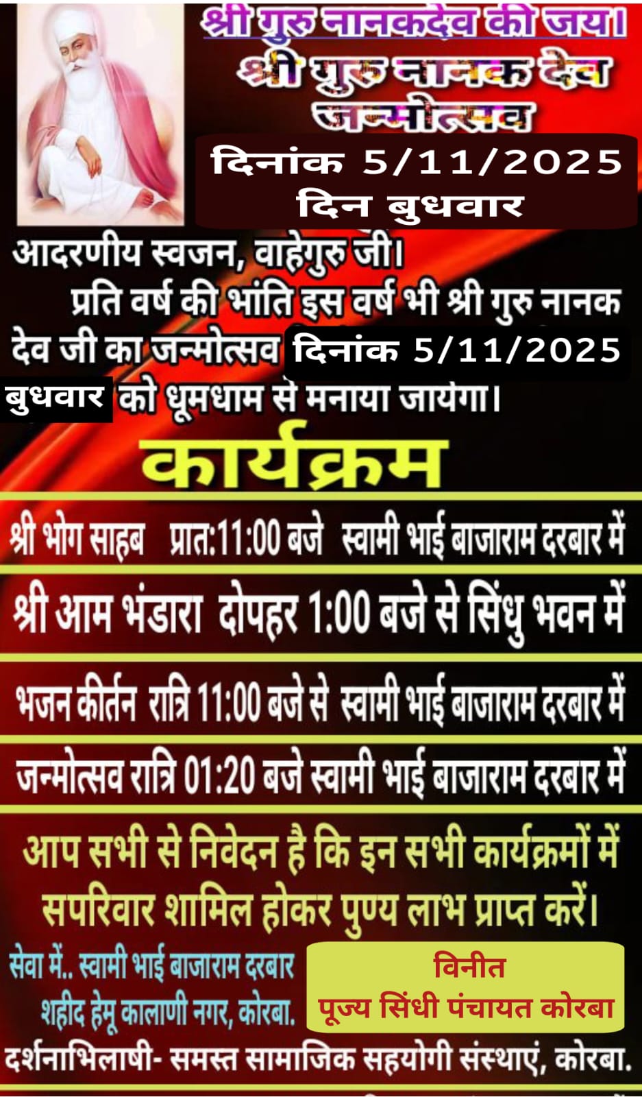 कोरबा :- पूज्य सिंधी पंचायत कोरबा के द्वारा प्रतिवर्ष की भांति इस वर्ष भी सिखों के प्रथम गुरु श्री गुरु नानक देव जी का 556 वां प्रकाश उत्सव नगर में बड़े ही हर्षोउल्लास के साथ मनाया जाएगा जिसमें 4 नवंबर को मंगलवार प्रात 5:00 बजे से प्रभात फेरी निकाली जाएगी जो कि स्वामी भाई बाजाराम दरबार से आरंभ होकर उषा कंपलेक्स रेलवे क्रॉसिंग मशीन लोड पटेल पारा रामसागरपारा पहुंचेगी ओवर ब्रिज से मेन रोड होकर संत कंवर राम उद्यान रानी रोड होते हुए स्वामी भाई बाजाराम दरबार में पहुंचकर कुछ विश्राम होगी आए हुए सभी साध संगत के लिए प्रसाद वितरण किया जाएगा अरदास पल्लव के पश्चात,