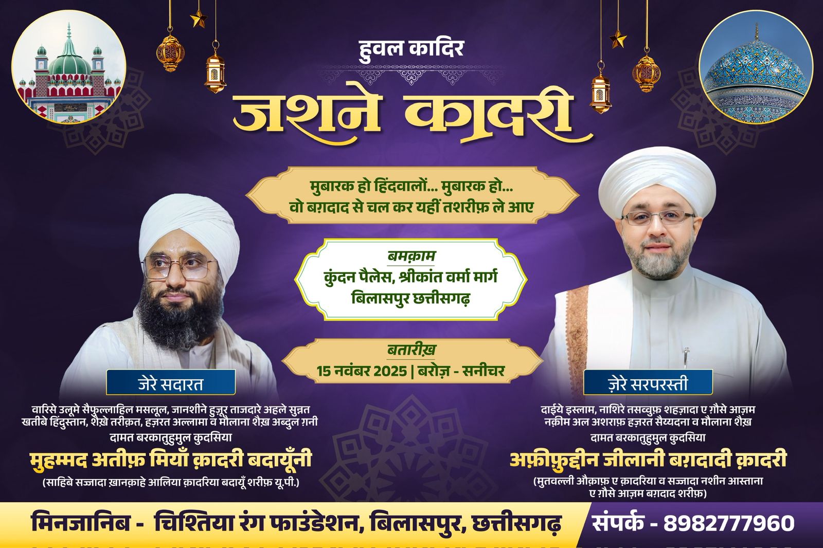 बिलासपुर :- चिश्तीयां रंग के सदस्य सैय्यद सईद ने जानकारी देते हुये बताया की मुख्यमंत्री श्री विष्णु देव साय जी ने कुछ दिन पूर्व जशने क़ादरी कान्फ्रेंस का पोस्टर विमोचन किया था उस पोस्टर का बहुमूल्य मुस्लिम एरिया तालापारा तरबहार मसान गंज कुदुदण्ड मांगला चुचीया पारा महमंद आदि मुस्लिम वार्ड मोहल्लो में जाकर जशने क़ादरी के पोस्टर का घर घर जाकर वितरित किया जाएगा तथा उक्त जानकारी देते हुए बताया की 15 नवंबर