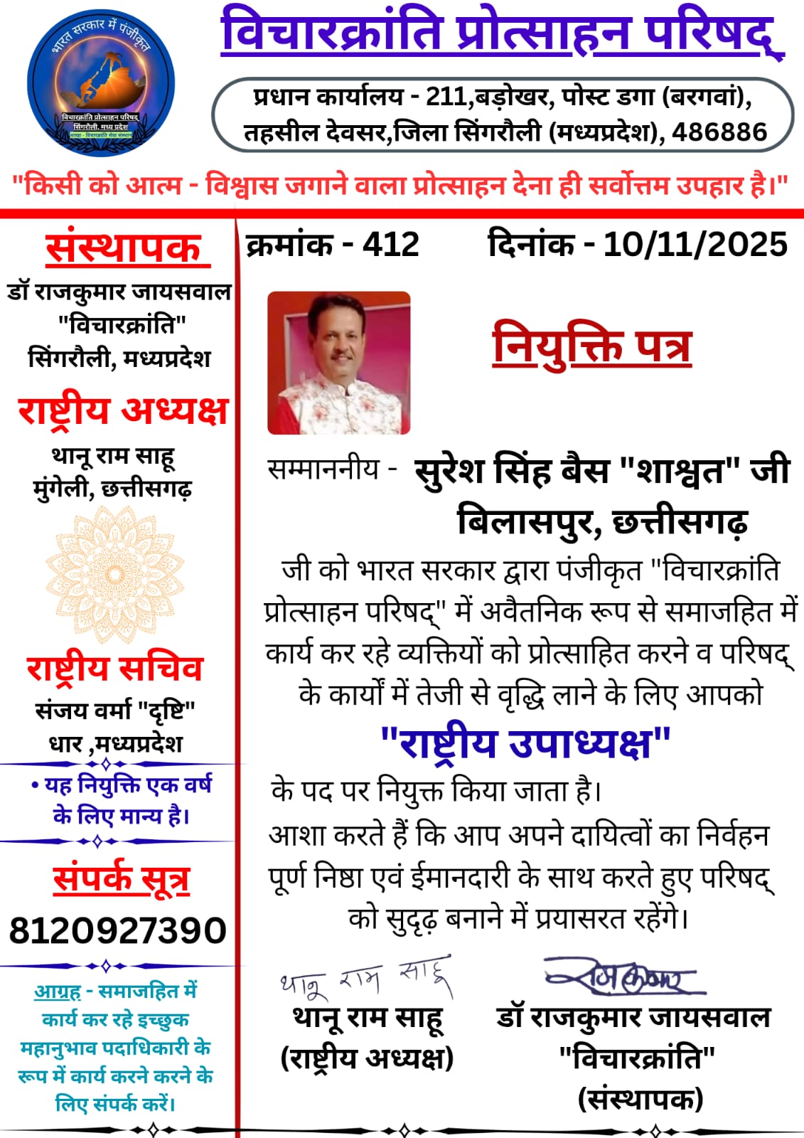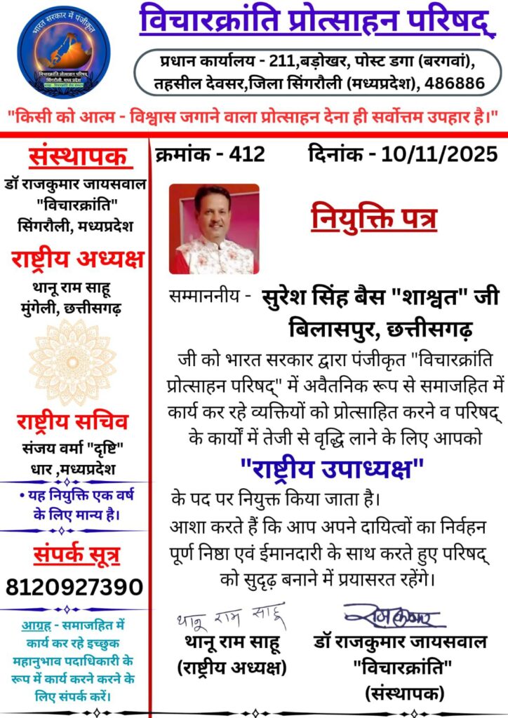 नियुक्ति पत्र में उन्होंने श्री बैस को राष्ट्रीय विचार क्रांति प्रोत्साहन परिषद का राष्ट्रीय उपाध्यक्ष पद नियुक्ति पश्चात शुभकामनाएं देते हुए कहा कि सम्माननीय – सुरेश सिंह बैस “शाश्वत” जी बिलासपुर, छत्तीसगढ़ आपको भारत सरकार द्वारा पंजीकृत “विचारक्रांति प्रोत्साहन परिषद्” में अवैतनिक रूप से समाजहित में कार्य कर रहे व्यक्तियों को प्रोत्साहित करने व परिषद् के कार्यों में तेजी से वृद्धि लाने के लिए “राष्ट्रीय उपाध्यक्ष”के पद पर नियुक्त किया जाता है।आशा करते हैं कि आप अपने दायित्वों का निर्वहन पूर्ण निष्ठा एवं ईमानदारी के साथ करते हुए परिषद् को सुदृढ़ बनाने में प्रयासरत रहेंगे। राष्ट्रीय उपाध्यक्ष पद के दायित्वों का वह पूरे हिंदुस्तान में सौंपे गए दायित्वों का निर्वहन करेंगे, और साहित्यिक गतिविधियों सहित समाज हित के विचारधाराओं और राष्ट्रीय हित के कार्यों के लिए कार्य करते हुए राष्ट्र उत्थान हेतु प्रयासरत रहेंगे।