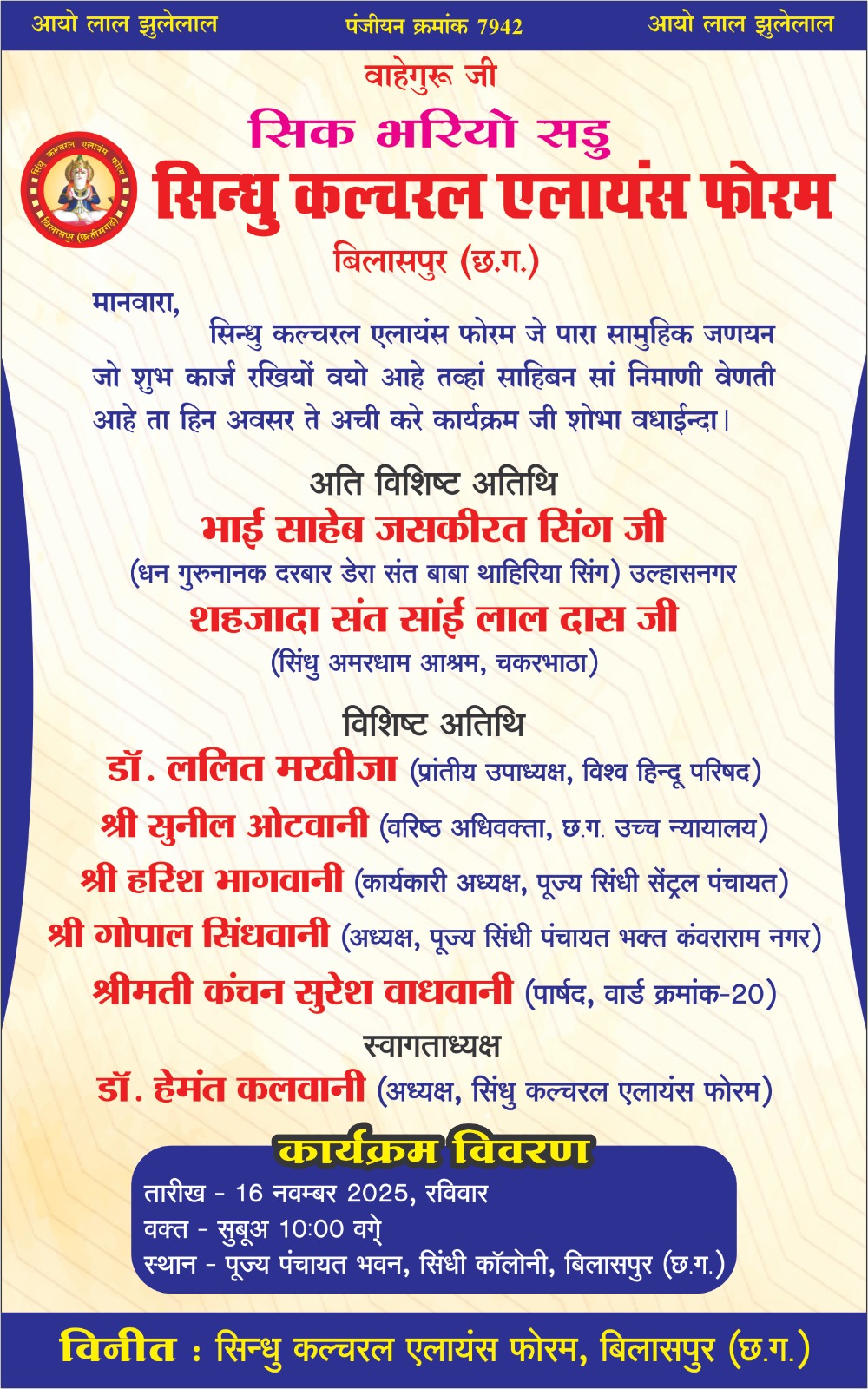 बिलासपुर ;- नगर की सामाजिक संस्था सिंधु कल्चरल एलायंस फोरम दवारा 16 नवंबर को होने वाले सामूहिक जनेऊ संस्कार के संदर्भ संस्था के अध्यक्ष डॉ. हेमंत कलवानी ने जानकारी देते हुए बताया कि उक्त कार्यक्रम अति विशिष्ट अतिथि के रूप में सिंधु अमर धाम आश्रम चकरभाठा के