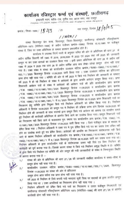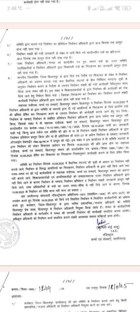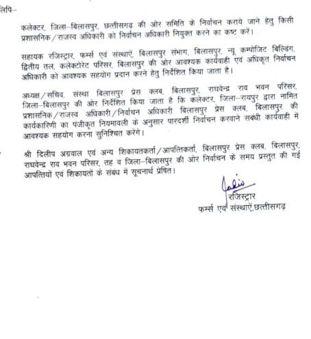 बिलासपुर:- विगत दो माह पहले बिलासपुर में बहुत गहमा गहमी थी क्योंकि बिलासपुर प्रेस क्लब का चुनाव होने जा रहा था और शुरू से ही इस चुनाव में गड़बड़ी की आशंका जताई जा रही थी और लगातार विपक्ष में जो पैनल था वह आरोप लगा राह था की चुनाव में नियम का पालन नहीं किया जा रहा है? संविधान के अनदेखी की जा रही है? और इसके लिए उन्होंने ब काएदा चुनाव अधिकारी को भी निवेदन किया आवेदन दिया की निष्पक्ष चुनाव होना चाहिए? पर उनकी आपत्ति को उनके आवेदन को दर किनारे करते हुए संविधान का पालन न करते हुए चुनाव की पूरी प्रतिक्रिया को अपनाया गया ?और लगभग 130 नए सदस्यों को प्रेस क्लब कि सदस्यता दी गई जो कि चुनाव के कुछ दिन पूर्व की घटना थी? जिसका बहुत विरोध हुआ था जो की असवेधानिक था? और उन्हें चुनाव में वोट देने का अधिकार भी दिया गया ताकि सत्ता पक्ष को इसका लाभ मिल सके? और हुआ भी वही चुनाव में चार पद उन्होंने जीत लिए विपक्ष के पास दो पद आए पर उन्होंने पहले ही पंजीयन फर्म ऑफिस में शिकायत दर्ज करा चुके थे,