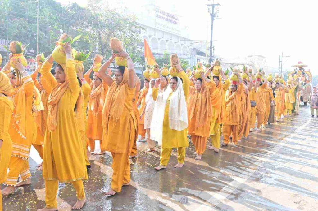 श्रीमद् भागवत कथा को सर पर रखकर और हाथ में भगवान श्री कृष्ण लड्डू गोपाल को गोद में उठाकर महंत सतगुरु अनन्तपुरी गोस्वामी जी जी आगे प्रस्थान कर रहे थे उनके पीछे 101 महिलाएं सिर पर कलश लेकर चल रही थी सुंदर रथ में पंडित कमल महाराज विराजमान होकर भक्तों को दर्शन दे रहे थे कलश यात्रा के मध्य में ही पहुंचे कथा व्यास श्री बलराम भैया जी ने भी भक्तों को दर्शन दिया तेलीबांदा भ्रमण करते हुए गली नंबर पांच सिंधी धर्मशाला में पहुंची यहां पर पंडित कमल महाराज के द्वारा विधि विधान के साथ पूजा अर्चना कराई गई पूजा के समापन के बाद प्रसाद वितरण किया गया