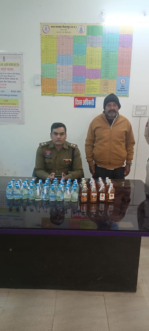 ⏩⏩विवरण – मामले का संक्षिप्त विवरण इस प्रकार है कि जिले में अवैध मदिरा की खरीदी बिक्री की शिकायत एवं इससे बढ़ते अपराध एवं चेतना अभियान के तहत रोकथाम एवं कड़ी कार्यवही हेतु वरिष्ठ पुलिस अधीक्षक महोदय बिलासपुर श्री रजनेश सिंह (भापुसे) के द्वारा आवश्यक दिशा निर्देश दिये गया था जिनके निर्देशानुसार अतिरिक्त पुलिस अधीक्षक महोदय (शहर) बिलासपुर श्री राजेन्द्र जायसवाल एवं नगर पुलिस अधीक्षक सिविल लाईन श्री निमितेश सिंह के मार्गदर्शन पर निरी कृष्णचंद सिदार थाना प्रभारी थाना तारबाहर के नेतृत्व में टीम बनाकर अवैध रूप शराब की बिक्री करने वाले आरोपीयो कि पतासाती हेतु रवाना हुये थे कि मुखबीर से सूचना मिला कि एक व्यक्ति स्कूटी में देशी मंदिरा प्लेन एवं मसाला शराब अवैध रूप से बिक्री करने के लिये ले जा रहा कि सूचना पर तत्काल सीएमडी चैक के आगे स्वदेशी प्लाजा पहुचकर घेराबंदी कर एक व्यक्ति एक्टिवा क्रमांक सी जी 10 बी डी 3328 को रोककर चेक करने पर उसके थैला एवं डिक्की से 65 नग देशी प्रत्येक में 180 एमएल भरा हुआ मिला आरोपी के कब्जे से कुल 65 नग शराब एवं एक्टिवा क्रमांक सी जी 10 बी डी 3328 को जप्त कर आरोपी को गिरफ्तार कर न्यायिक रिमांड पर जेल दाखिल किया गया है।