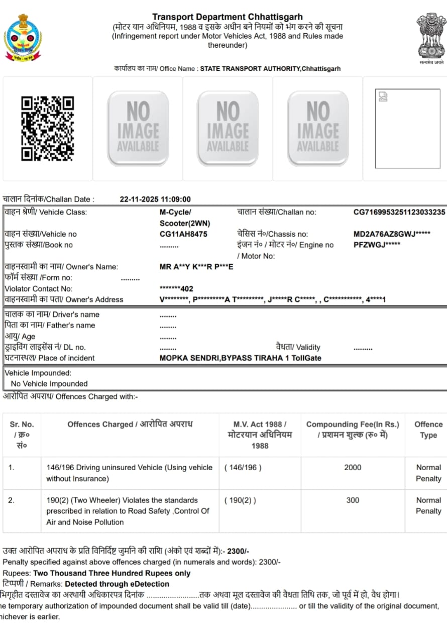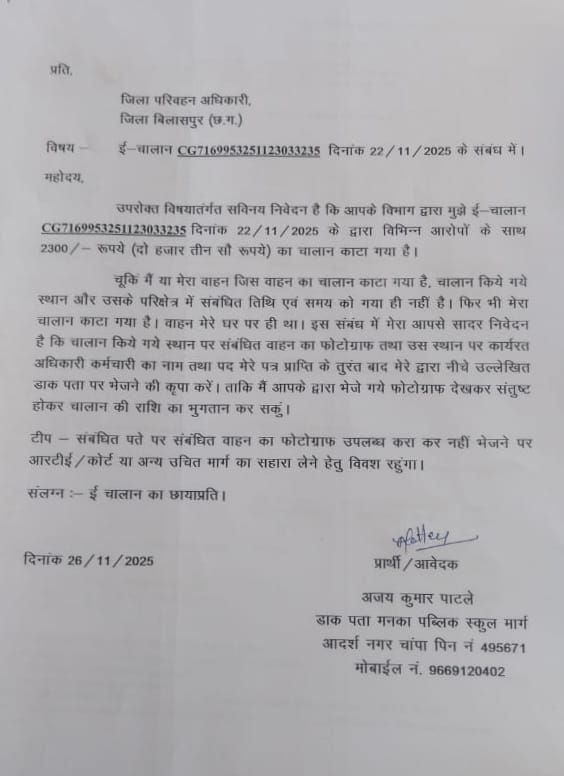 दिनांक 22 नवंबर को चांपा निवासी अजय पाटले को चालान कटने का मेसेज आया कि आपके वाहन को मोपका सेन्द्रि बाई पास मार्ग पर देखा गया है और इंश्योरेंस और प्रदूषण के लिए 2000 और 300 का चालान काटा गया है। जबकि पीड़ित का वाहन कई दिनों से घर पर ही खड़ा हुआ था इसपर उन्होंने परिवहन विभाग बिलासपुर के अधिकारी से पत्र के माध्यम से उस दिन का फोटो मांग करते हुए चालान को रद्द करने शिकायत पत्र लिखा है ।