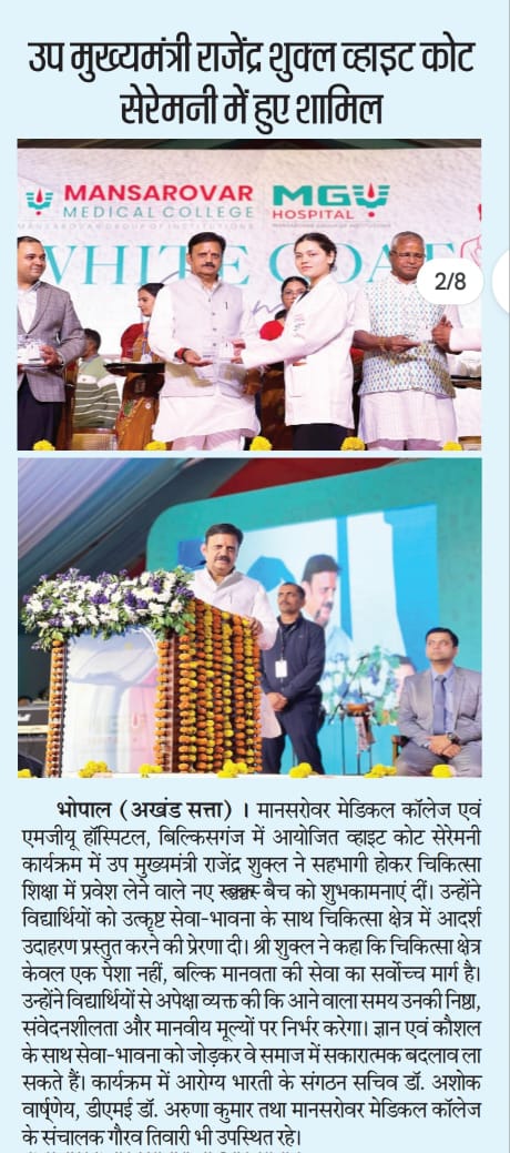 मानसरोवर मेडिकल कॉलेज एवं एमजीयू हॉस्पिटल, बिल्किसगंज में आयोजित व्हाइट कोट सेरेमनी कार्यक्रम में उप मुख्यमंत्री राजेंद्र शुक्ल ने सहभागी होकर चिकित्सा शिक्षा में प्रवेश लेने वाले नए MBBS बैच को शुभकामनाएं दीं। उन्होंने विद्यार्थियों को उत्कृष्ट सेवा-भावना के साथ चिकित्सा क्षेत्र में आदर्श उदाहरण प्रस्तुत करने की प्रेरणा दी।