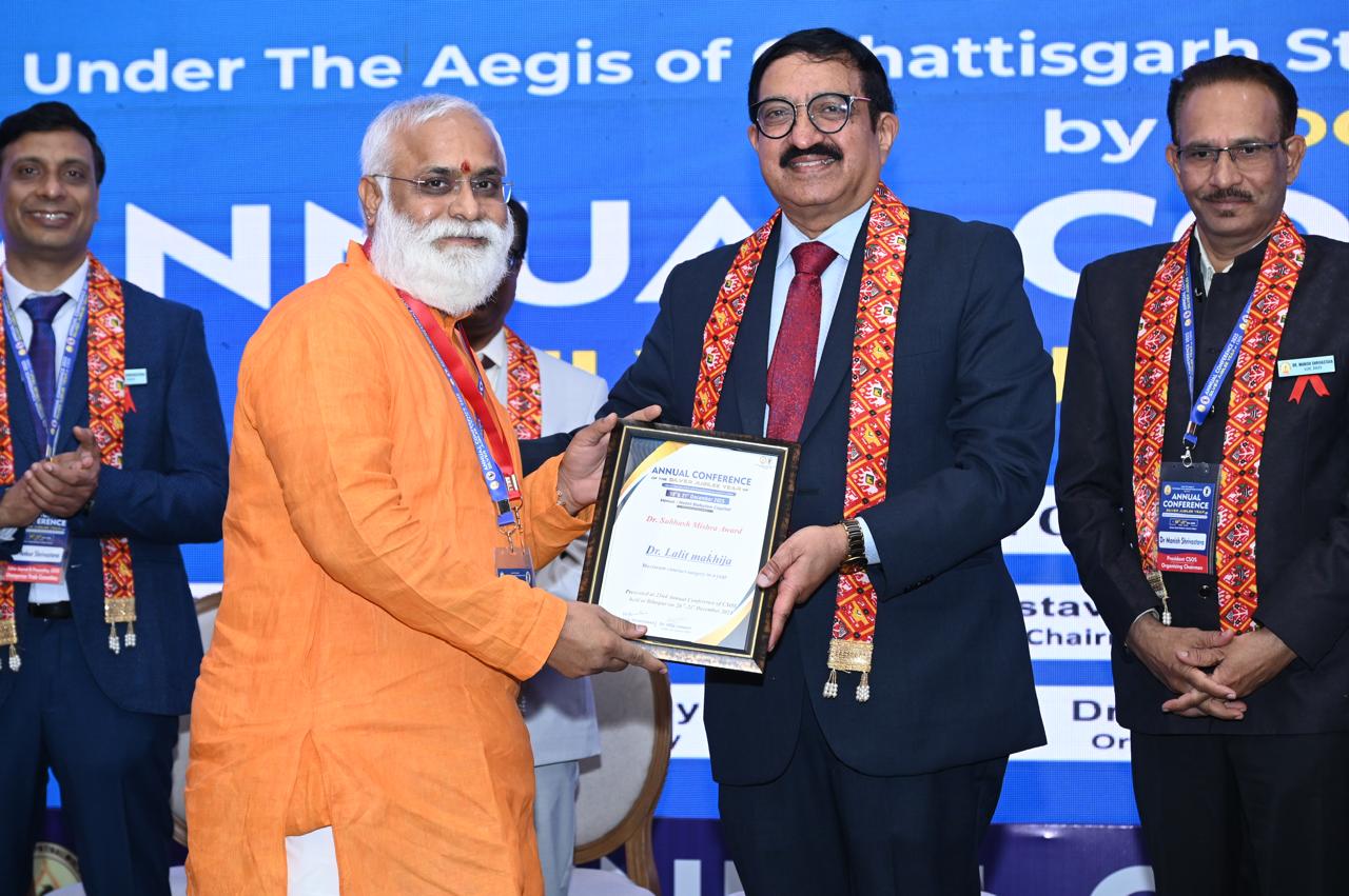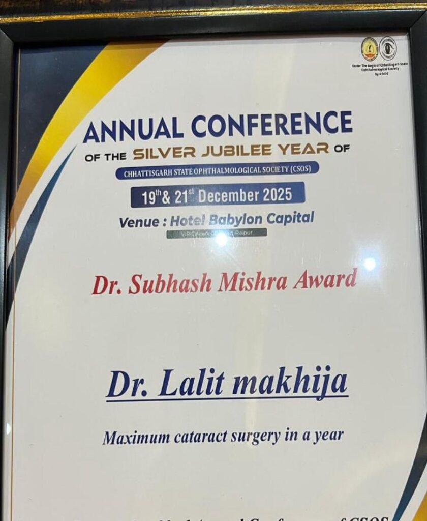 बिलासपुर :+ डॉ ललित माखीजा को वर्ष 24-25 में सबसे ज़्यादा मोतियाबिंद ऑपरेशन करने पर छत्तीसगढ़ स्टेट ऑप्थैल्मोलॉजिकल सोसाइटी द्वारा डॉ सुभाष मिश्रा गोल्ड मेडल अवार्ड दिया गया ।