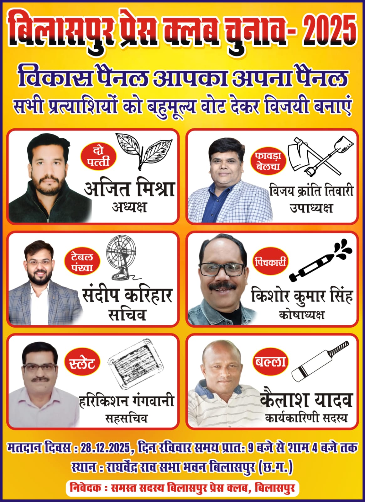 बिलासपुर। न्यायधानी के प्रेस क्लब चुनाव का बिगुल फुकते ही पत्रकारों के बीच सियासी पारा चढ़ गया है। राघवेंद्र राव सभा भवन में शनिवार को सुबह से ही ऐसी गहमागहमी रही जैसे कोई विधानसभा का चुनाव हो। मजे की बात यह है कि दो बार प्रेस क्लब में पदाधिकारी रहकर भी कुछ लोगों की पद की भूख शांत नहीं हुई। हाईकोर्ट के आदेश पर पद से हटाए जाने वाले फिर से मैदान में ताल ठोकने पहुंच गए। हालांकि प्रशासन ने प्रेस क्लब के संविधान के नियमों के तहत सख्ती दिखाई, और नियमों के पेंच में फंसे कमलेश शर्मा का नामांकन खारिज कर दिया। अब अध्यक्ष से लेकर कार्यकारिणी सदस्य के पदों के लिए कुल 19 प्रत्याशी चुनावी मैदान में अपनी किस्मत आजमाएंगे।