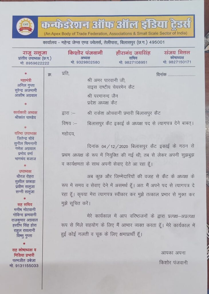 दिनांक 26 दिसम्बर 2025 को कैट बिलासपुर के अध्यक्ष किशोर पंजवानी ने अपने पद से त्यागपत्र दे दिया है , उन्होंने अपने त्यागपत्र में समय की अनुपलब्धता व ओर जिम्मेदारियों के व्यस्तम समय का हवाला देते हुए इस्तीफा बिलासपुर कैट के प्रभारी राकेश ओचवानी के द्वारा श्री अमर पारवानी राष्ट्रीय वाइस चेयरमैन कैट व श्री परमानन्द जेन प्रदेश अध्यक्ष कैट को भेजा है ।