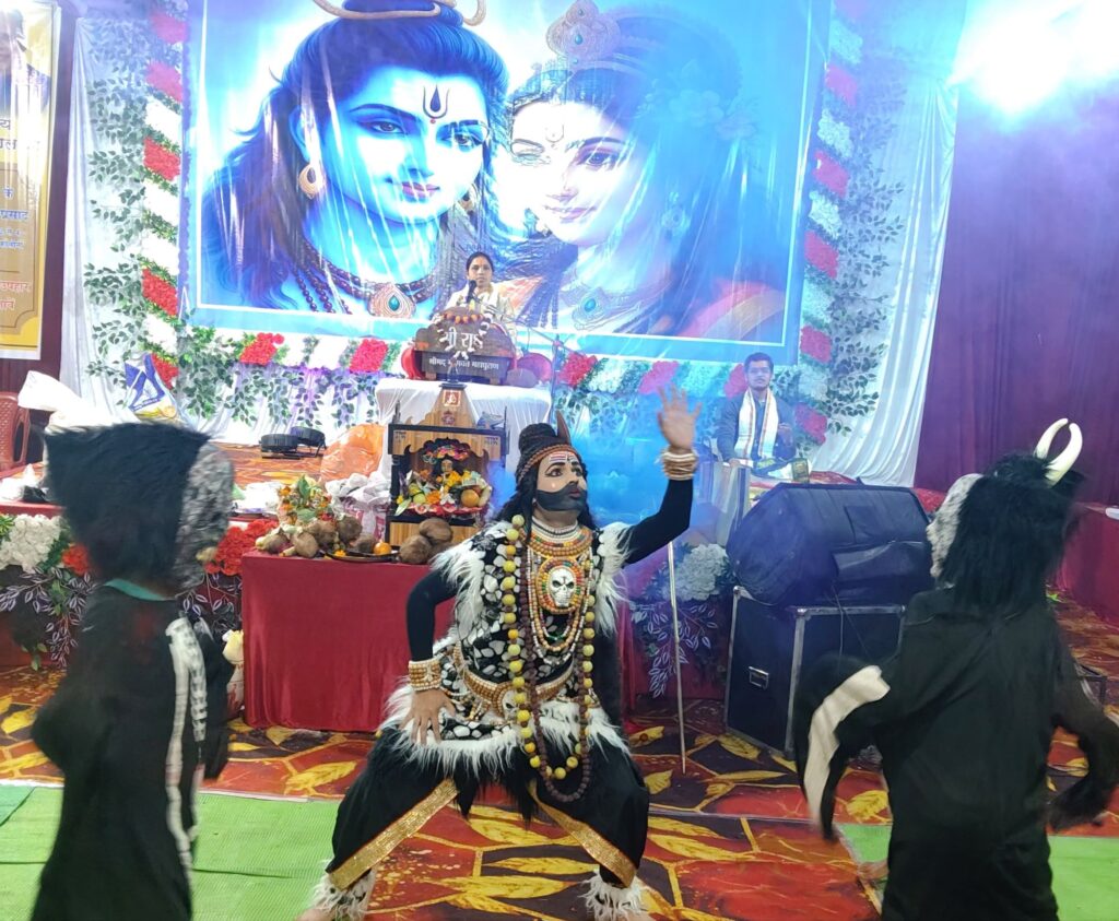 शिव महापुराण कथा के सोमवार को भगवान शिव के शक्तिशाली नृत्य ” शिव तांडव ” की सुंदर प्रस्तुतियां हुईं, जिससे दर्शक बहुत भावुक और आनंदित हो गए। शिव के रौद्र और आनंद रूप का सुंदर चित्रण से श्रद्धालु गण मंत्रमुग्ध हो गये।