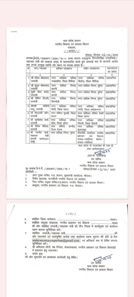 सूत्रों के अनुसार, संचालनालय, भोपाल द्वारा दिनांक 03 मार्च 2025 को नगर निगम कटनी में पदस्थ दो उपयंत्री—मोना करेरा एवं मृदुल श्रीवास्तव का नगर निगम मुरैना ट्रांसफर किया गया था।