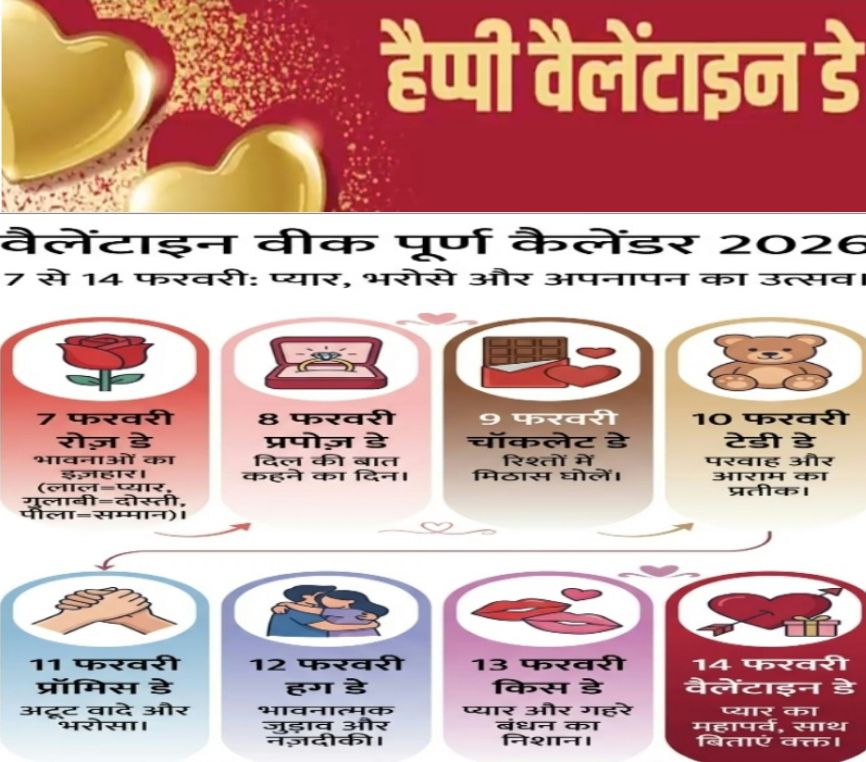 साथियों बात अगर हम वैलेंटाइन वीक 7 से 14 फरवरी 2026: तिथियाँ और उनका भावनात्मक महत्व को समझने की करें तो, वैलेंटाइन वीक 2026 की शुरुआत 7 फरवरी से होती है और 14 फरवरी को वैलेंटाइन डे के साथ इसका समापन होता है। इस सप्ताह का प्रत्येक दिन किसी न किसी भावना, प्रतीक और रिश्ते के पहलू को समर्पित है।7 फरवरी- रोज़ डे:प्रेम की कोमल शुरुआत रोज़ डे वैलेंटाइन वीक की पहली सीढ़ी है। गुलाब फूल प्रेम,सौंदर्य और भावनाओं की कोमलता का प्रतीक माना जाता है। लाल गुलाब गहरे प्रेम का संकेत देता है, गुलाबी अपनापन और प्रशंसा का,सफेद शांति और सम्मान का, जबकि पीला दोस्ती और खुशी का प्रतीक है। रोज़ डे रिश्तों की शुरुआत को सौम्यता और संवेदनशीलता के साथ दर्शाता है।8फरवरी-प्रपोज़ डे:भावनाओं को शब्दों में ढालने का दिन-प्रपोज़ डे वह दिन है जब लोग अपने दिल की बात खुलकर सामने रखते हैं। यह केवल रोमांटिक रिश्तों तक सीमित नहीं, बल्कि दोस्ती, साझेदारी और जीवनभर के साथ का प्रस्ताव भी हो सकता है।भारतीय संदर्भ में यह दिन ईमानदारी, सम्मान और स्पष्टता के साथ भावनाओं को व्यक्त करने का संदेश देता है।9 फरवरी -चॉकलेट डे:रिश्तों में मिठास का प्रतीक चॉकलेट डे रिश्तों में मिठास और खुशी घोलने का दिन माना जाता है।चॉकलेट न केवल स्वाद में मीठी होती है, बल्कि वैज्ञानिक रूप से भी यह मूड बेहतर करने में सहायक मानी जाती है। यह दिन यह दर्शाता है कि छोटे- छोटे इशारे भी रिश्तों को मजबूत बना सकते हैं।10 फरवरी-टेडी डे:केयर और मासूमियत की अभिव्यक्तिटेडी डे मासूमियत, देखभाल और भावनात्मक सुरक्षा का प्रतीक है। सॉफ्ट टॉय की तरह ही प्रेमी का दिल भी कोमल और संवेदनशील होता है। यह दिन यह सिखाता है कि रिश्तों में कठोरता नहीं, बल्कि कोमलता और समझ जरूरी है।11 फरवरी-प्रॉमिस डे:विश्वास और प्रतिबद्धता का आधार- प्रॉमिस डे किसी भी रिश्ते की नींव को मजबूत करने का दिन है।वादे केवल शब्द नहीं, बल्कि जिम्मेदारी और भरोसे की अभिव्यक्ति होते हैं। भारतीय संस्कृति में वचन और संकल्प को अत्यंत पवित्र माना गया है,इसलिए यह दिन पारंपरिक मूल्यों से भी गहराई से जुड़ता है।12 फरवरी-हग डे:अपनापन और भावनात्मक सुरक्षा-हग डे गले लगकर अपनापन, भरोसा और भावनात्मक जुड़ाव दिखाने का दिन है। मनोवैज्ञानिक रूप से भी एक सम्मानजनक