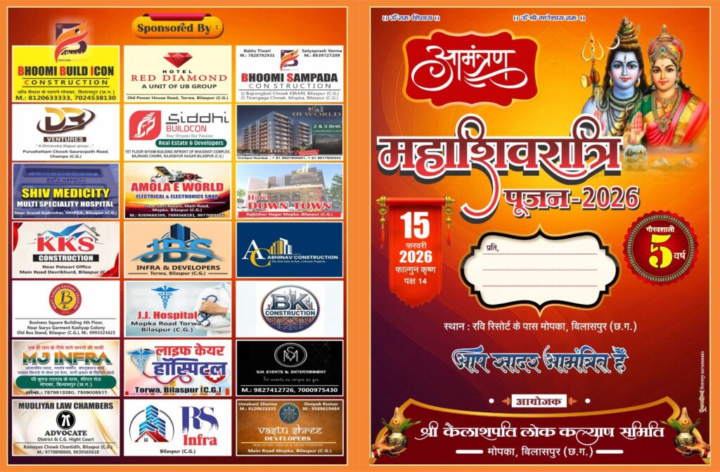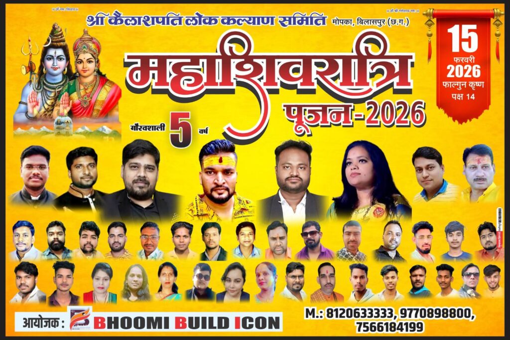 рдмрд┐рд▓рд╛рд╕рдкреБрд░ред рд╢реНрд░реА рдХреИрд▓рд╛рд╢рдкрддрд┐ рд▓реЛрдХ рдХрд▓реНрдпрд╛рдг рд╕рдорд┐рддрд┐ рджреНрд╡рд╛рд░рд╛ 15 рдлрд░рд╡рд░реА рдорд╣рд╛рд╢рд┐рд╡рд░рд╛рддреНрд░рд┐ рдХреЛ рдзрд╛рдирдордВрдбреА рдХреЗ рд╕рдореАрдк рдореЛрдкрдХрд╛ рдЦреЗрд▓ рдореИрджрд╛рди рдореЗрдВ рдЖрджрд┐ рджреЗрд╡ рдорд╣рд╛рджреЗрд╡ рдПрд╡рдВ рдорд╛рдБ рдЖрджрд┐рд╢рдХреНрддрд┐ рдкрд╛рд░реНрд╡рддреА рдХрд╛ рдкрд╛рд╡рди рд╡рд┐рд╡рд╛рд╣реЛрддреНрд╕рд╡ рд╣рд░реНрд╖реЛрд▓реНрд▓рд╛рд╕ рдХреЗ рд╕рд╛рде рдордирд╛рдпрд╛ рдЬрд╛рдПрдЧрд╛ред рдпрд╣ рдЖрдпреЛрдЬрди рдЗрд╕ рд╡рд░реНрд╖ рдЕрдкрдиреЗ рдкрд╛рдБрдЪрд╡реЗрдВ рд╡рд░реНрд╖ рдореЗрдВ рдкреНрд░рд╡реЗрд╢ рдХрд░ рд░рд╣рд╛ рд╣реИ рдФрд░ рдирд┐рд░рдВрддрд░ рдмрдврд╝рддреА рд╢реНрд░рджреНрдзрд╛рд▓реБрдУрдВ рдХреА рд╕рд╣рднрд╛рдЧрд┐рддрд╛ рдЗрд╕реЗ рд╢рд╣рд░ рдХрд╛ рдкреНрд░рдореБрдЦ рдзрд╛рд░реНрдорд┐рдХ рдЙрддреНрд╕рд╡ рдмрдирд╛ рд░рд╣реА рд╣реИред