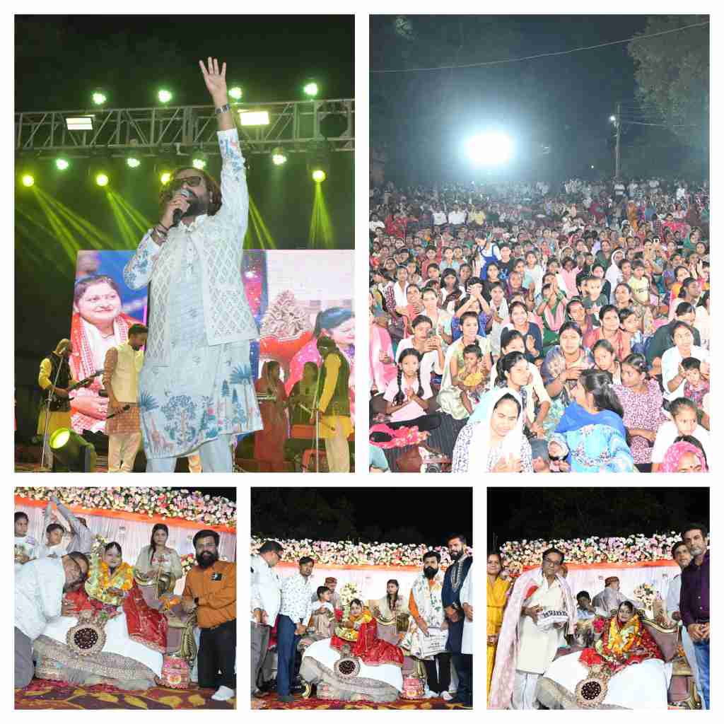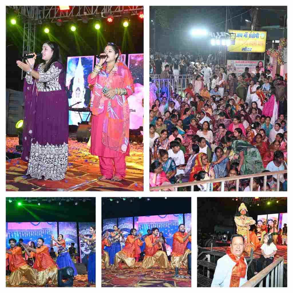 रायपुर/ मांढर :- प्रतिवर्ष की भांति इस वर्ष भी नवरात्रि के पावन अवसर पर जय मां संतोषी जय मां वैभव लक्ष्मी धाम मांढर में चैत्र नवरात्रि का पर्व बड़े ही हर्षोउल्लास के साथ मनाया गया इसी कड़ी में सप्तमी की रात को रात्रि 10:00 बजे भजन सम्राट अनुराग शर्मा स्टार नाइट रायपुर के द्वारा भक्ति मेंय संगीत मेंय शानदार भजनों की प्रस्तुति दी गई साथ सजीव झांकियां का प्रदर्शन भी किया गया, कार्यक्रम की शुरुआत मां दुर्गा के फोटो पर पुष्प अर्पित कर दीप प्रजवलित करके की गई जैसे ही मांढर वाली माता जी का आगमन हुआ भक्तों के द्वारा भव्य आतिशबाजी की गई फूलों की वर्षा की गई माता रानी का स्वागत सत्कार किया गया कार्यक्रम की शुरुआत भगवान श्री गणेश की वंदना से की गई एक से बढ़कर एक माता के लोकगीत छत्तीसगढ़ी गीत हिंदी गीत की प्रस्तुति दी गई