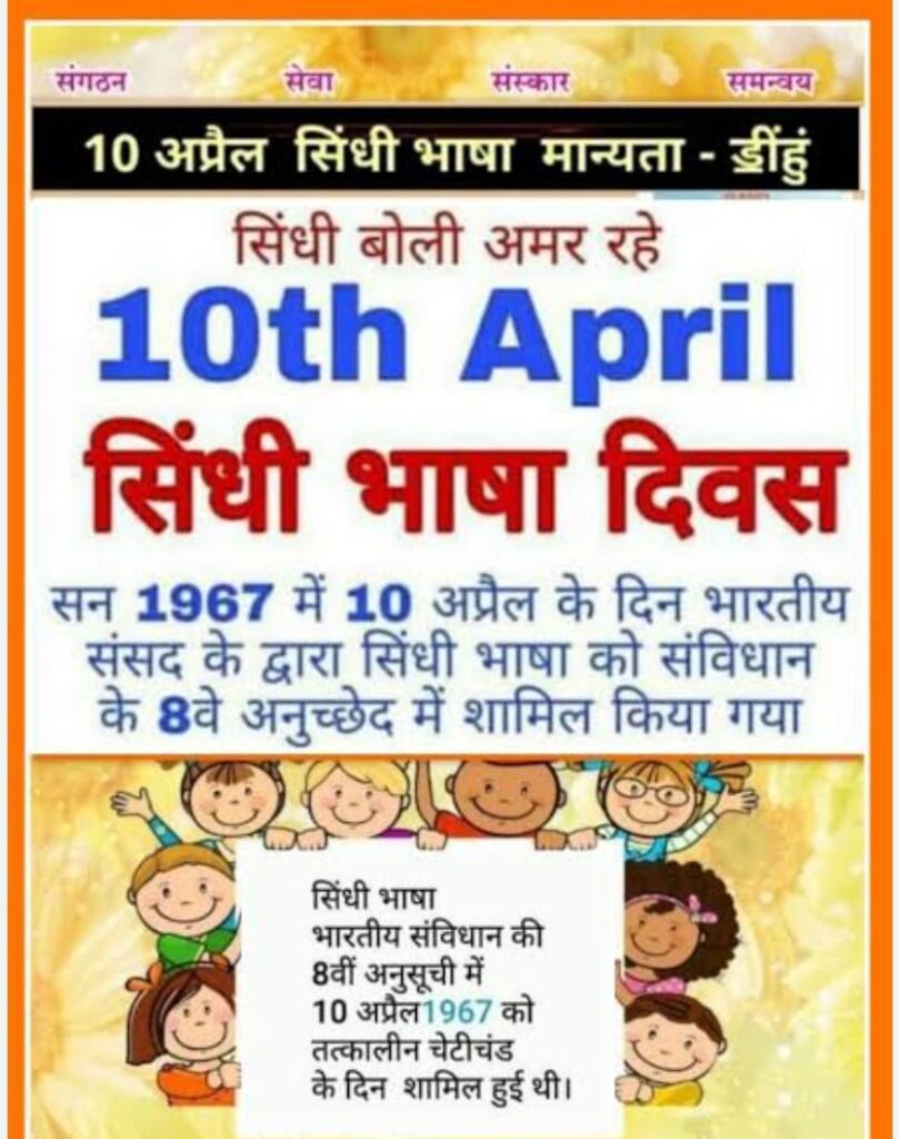 भारत के सिन्धी समुदाय के लिए 10 अप्रैल 1967 का दिन एक ऐतिहासिक दिन था जब इस दिन भारत के तत्कालीन महामहिम राष्ट्रपति महोदय जी ने सिन्धी भाषा को भारत के संविधान की 8वीं अनुसूची में शामिल किए जाने वाले संविधान संशोधन पर हस्ताक्षर किये थे। इसलिए इस दिन को सिन्धी समाज द्वारा सिन्धी भाषा दिवस के रुप में मनाया जाता है।